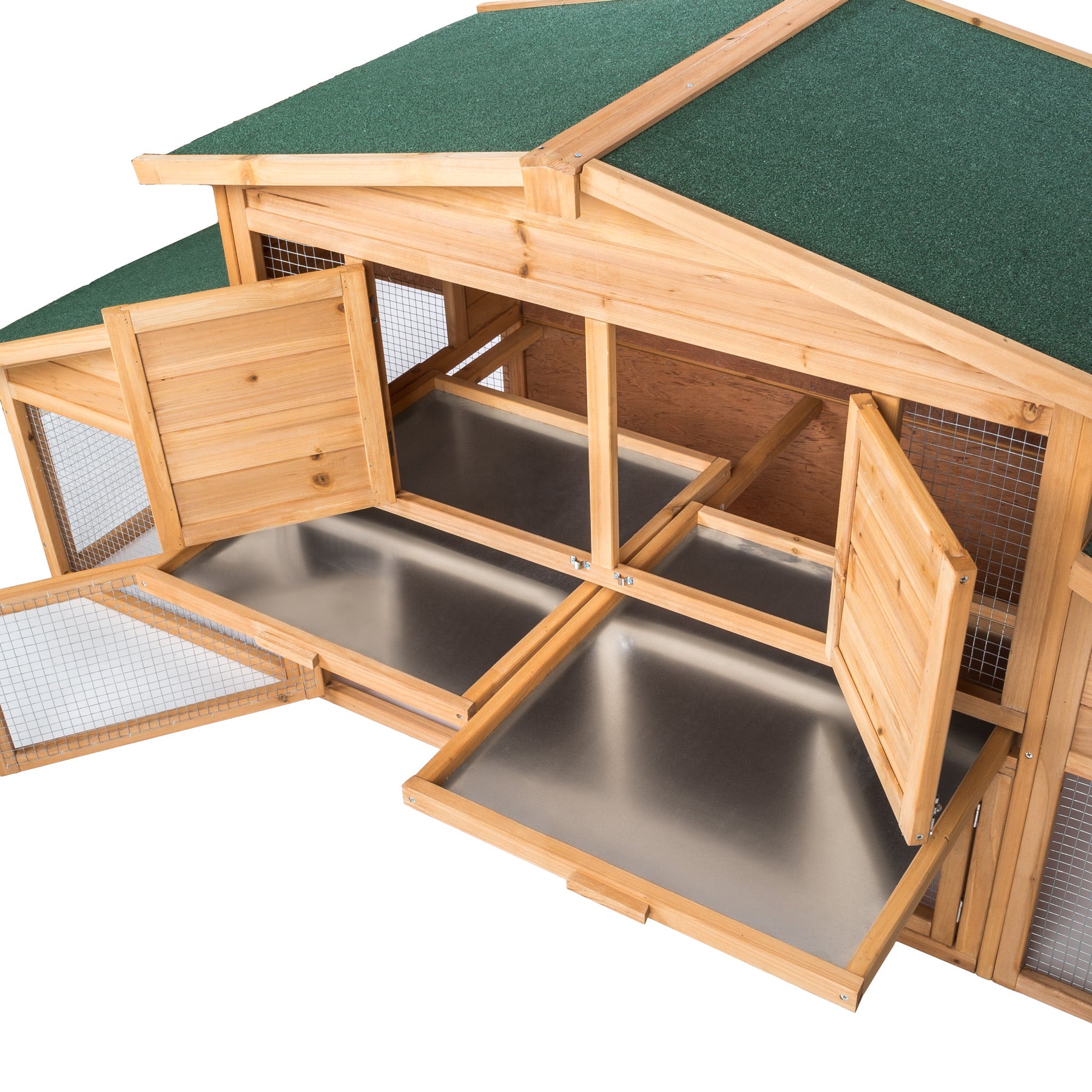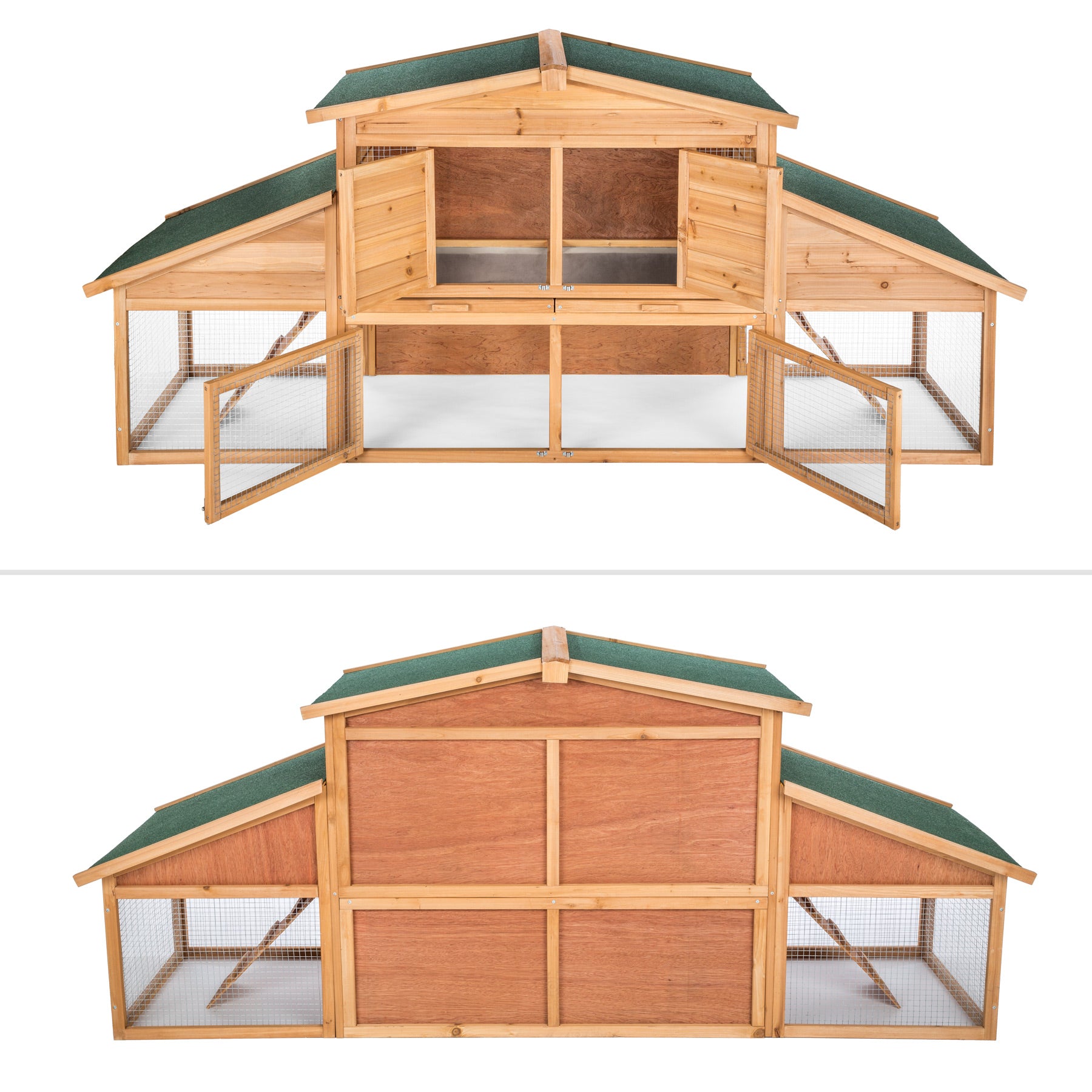Dit mooie konijnenhok met twee verdiepingen is uiterst praktisch en functioneel. Kleine dieren zoals konijnen en kippen maar ook cavia's of chinchilla's voelen zich hier heel goed. Naast een vrije loopruimte met open bodem die grazen mogelijk maakt, zijn er ook afgeschermde rustzones waarin de dieren zich kunnen terugtrekken en ook beschermd zijn tegen weersinvloeden. Door de daken zijn je lievelingen veilig voor roofvogels, katten of vossen. Het bovenste gedeelte is bereikbaar via twee klimladders en beschikt over uittrekbare lades voor eenvoudige reiniging. Vier vergrendelbare deuren bieden eenvoudige toegang.