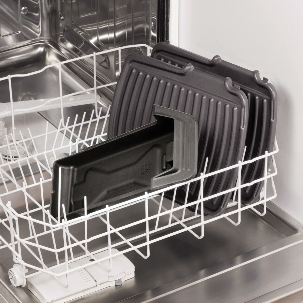 Opvangbakje voor vet De thermostaat is regelbaar en de overtollige vet en vleessappen worden opgevangen in de opvangbak onder de grill. De grillplaten zijn makkelijk uitneembaar en hebben een anti-aanbaklaag. Daarnaast kunnen ze in de vaatwasser. Door de controlelampjes zie je wanneer het apparaat aan staat en wanneer het klaar is voor gebruik.