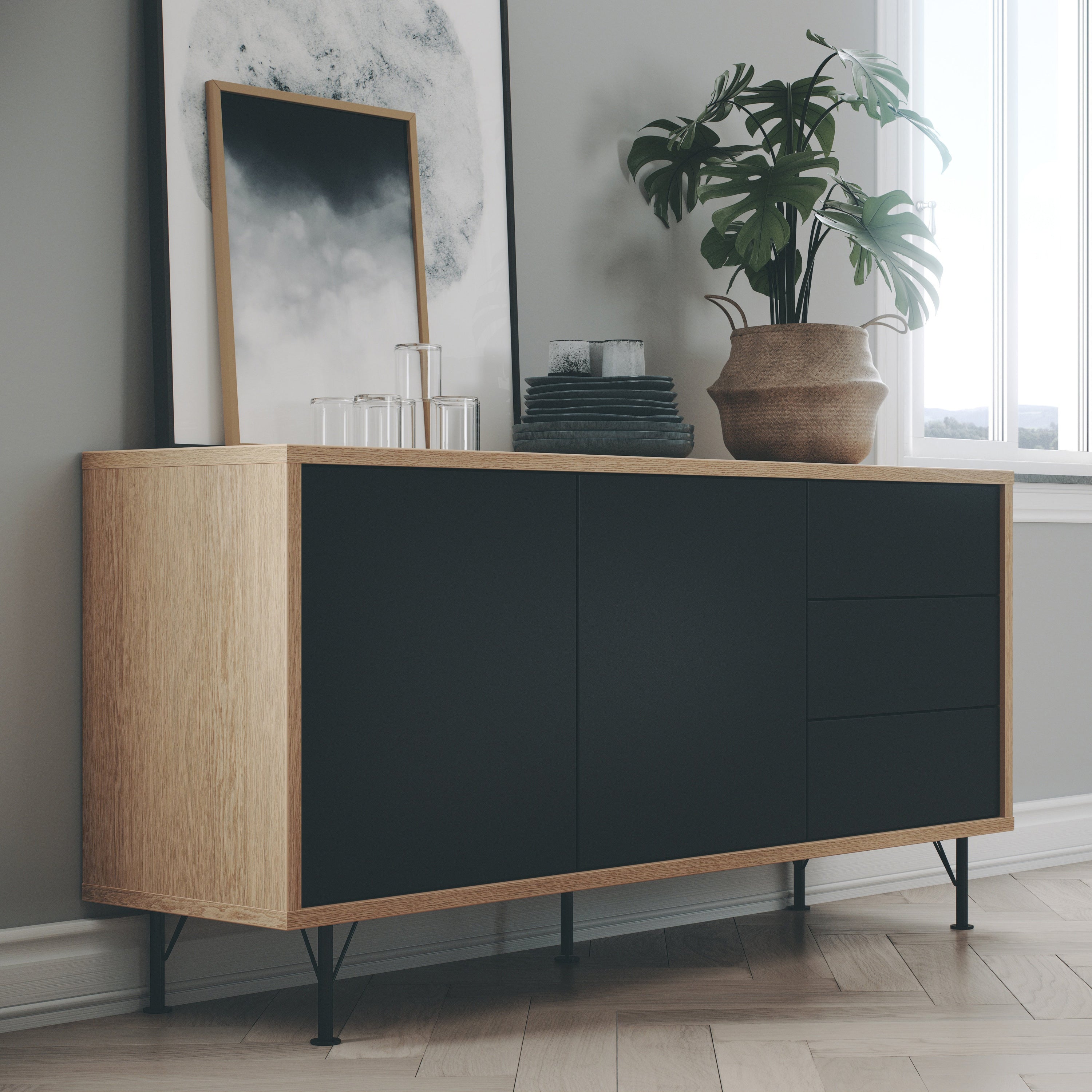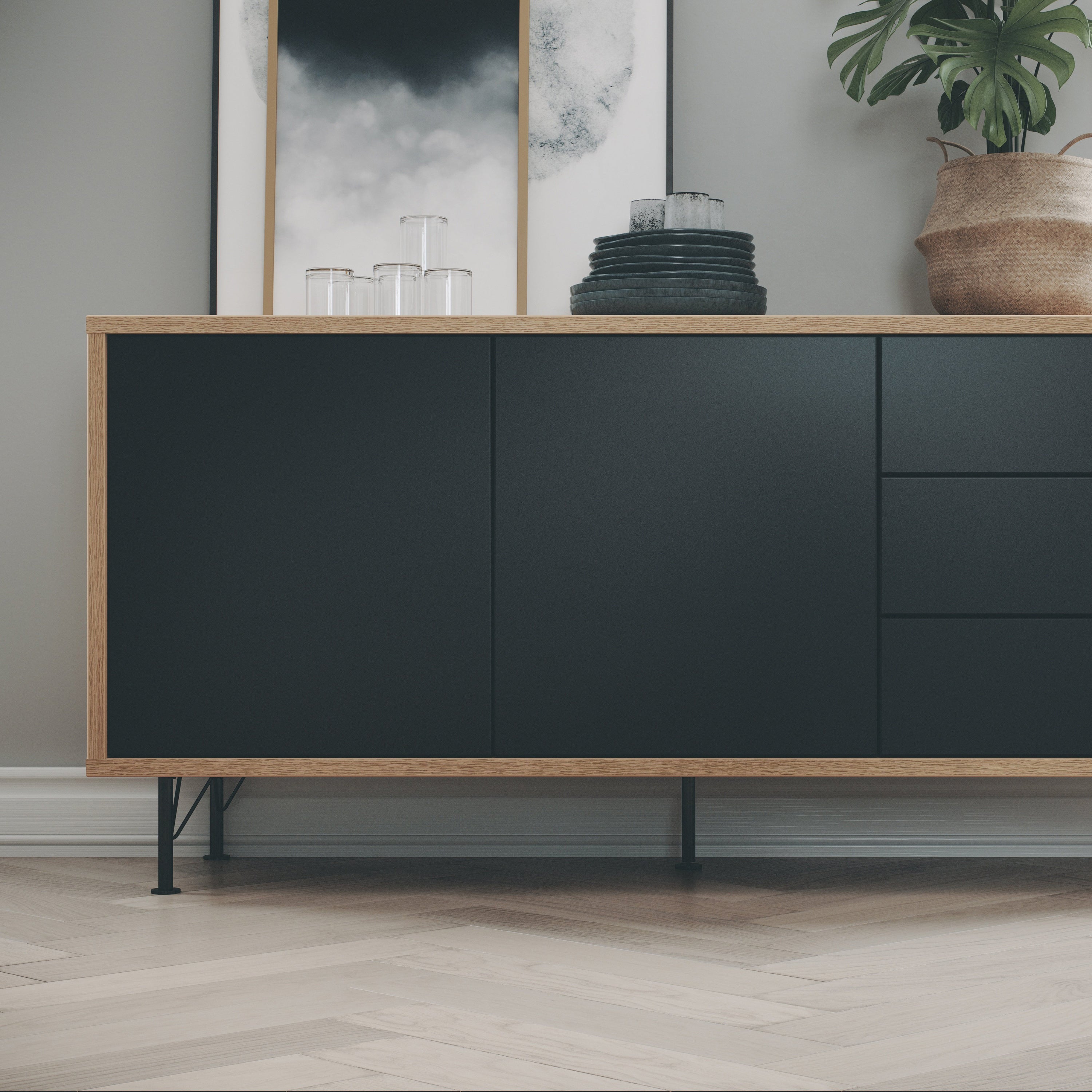 Go with the Flow De Flow serie van Tenzo zorgt door zijn combinatie van zwart met eiken echt voor een frisse wind in huis. Er wordt voor het framewerk gebruik gemaakt van 25 mm spaanplaat eiken melamine en de zwarte deuren zijn gemaakt van 16 mm dik MDF. De stijlvolle meubels van de Flow serie worden ondersteund door mat gelakte, metalen poten. De deuren zijn allemaal voorzien van het handige 'push to open' systeem.