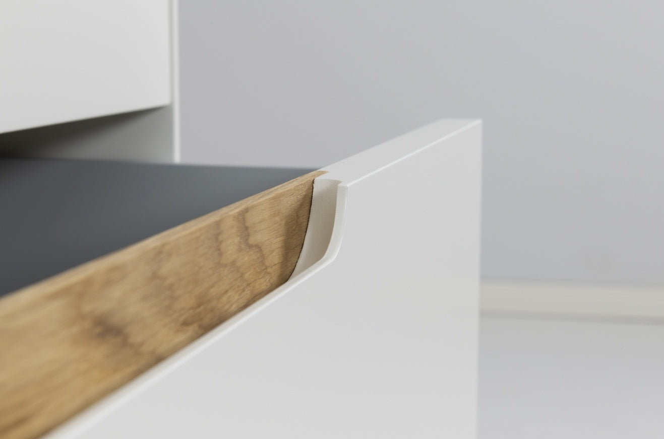 - Materiaal: gespoten MDF, meubelplaat, eiken handgrepen