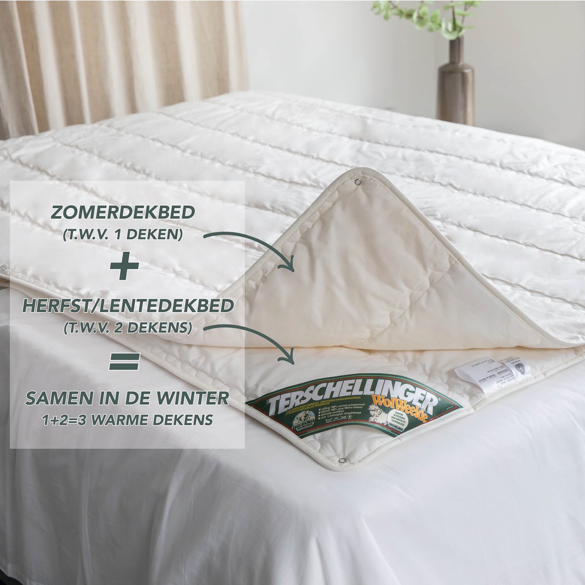 De extreem gekroesde wol-kwaliteit vormt ’n luxe laag van miljoenen luchtkussentjes, die zorg dragen voor optimale ventilatie, onovertroffen vochtregulatie en een unieke warmtespreiding. De gekaarde wol wordt zo behandeld, dat alle natuurlijke ingrediënten (zoals Lanoline) behouden blijven, zodat de unieke werking van wol volledig gehandhaafd blijft. De dekbedden zijn volledig doorgestikt in banen, zodat de edele vulling nooit kan verschuiven en het dekbed soepel om het lichaam voegt. Terschellinger dekbedden zijn brandvertragend, vlamdovend en worden 3 jaar volledig gegarandeerd. Voorzien van sterke metalen drukknopen. Kortom:’n Ideaal dekbed voor zomer én winter van de hoogste kwaliteit. Van top tot teen natuurlijk comfort…