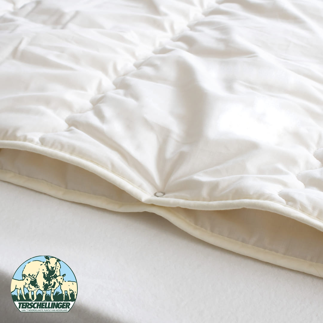 De extreem gekroesde wol-kwaliteit vormt ’n luxe laag van miljoenen luchtkussentjes, die zorg dragen voor optimale ventilatie, onovertroffen vochtregulatie en een unieke warmtespreiding. De gekaarde wol wordt zo behandeld, dat alle natuurlijke ingrediënten (zoals Lanoline) behouden blijven, zodat de unieke werking van wol volledig gehandhaafd blijft. De dekbedden zijn volledig doorgestikt in banen, zodat de edele vulling nooit kan verschuiven en het dekbed soepel om het lichaam voegt. Terschellinger dekbedden zijn brandvertragend, vlamdovend en worden 3 jaar volledig gegarandeerd. Voorzien van sterke metalen drukknopen. Kortom:’n Ideaal dekbed voor zomer én winter van de hoogste kwaliteit. Van top tot teen natuurlijk comfort…