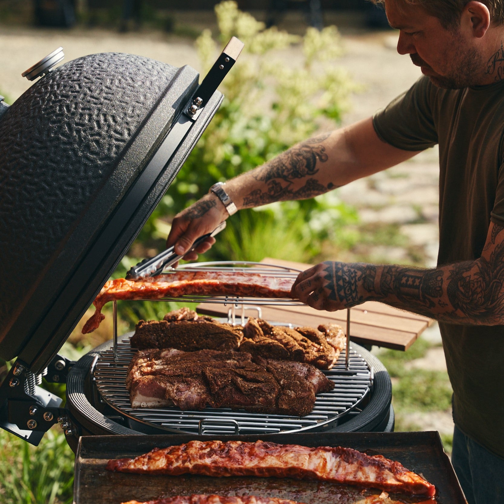 Multi Level Cooking System Een nieuwe toevoeging in 2022 aan The Bastard Large en Medium is het multi level cooking system. Met dit modulaire systeem transformeer je The Bastard in een alleskunner. Door het hitte schild of het rooster in tweeën te splitsen kun je op verschillende niveaus tegelijkertijd gerechten bereiden. Zo maak je gemakkelijk een complete maaltijd in één sessie. Toch liever wokken? Draai het rooster om en je hebt een pannenhouder voor je wok- of paella pan.