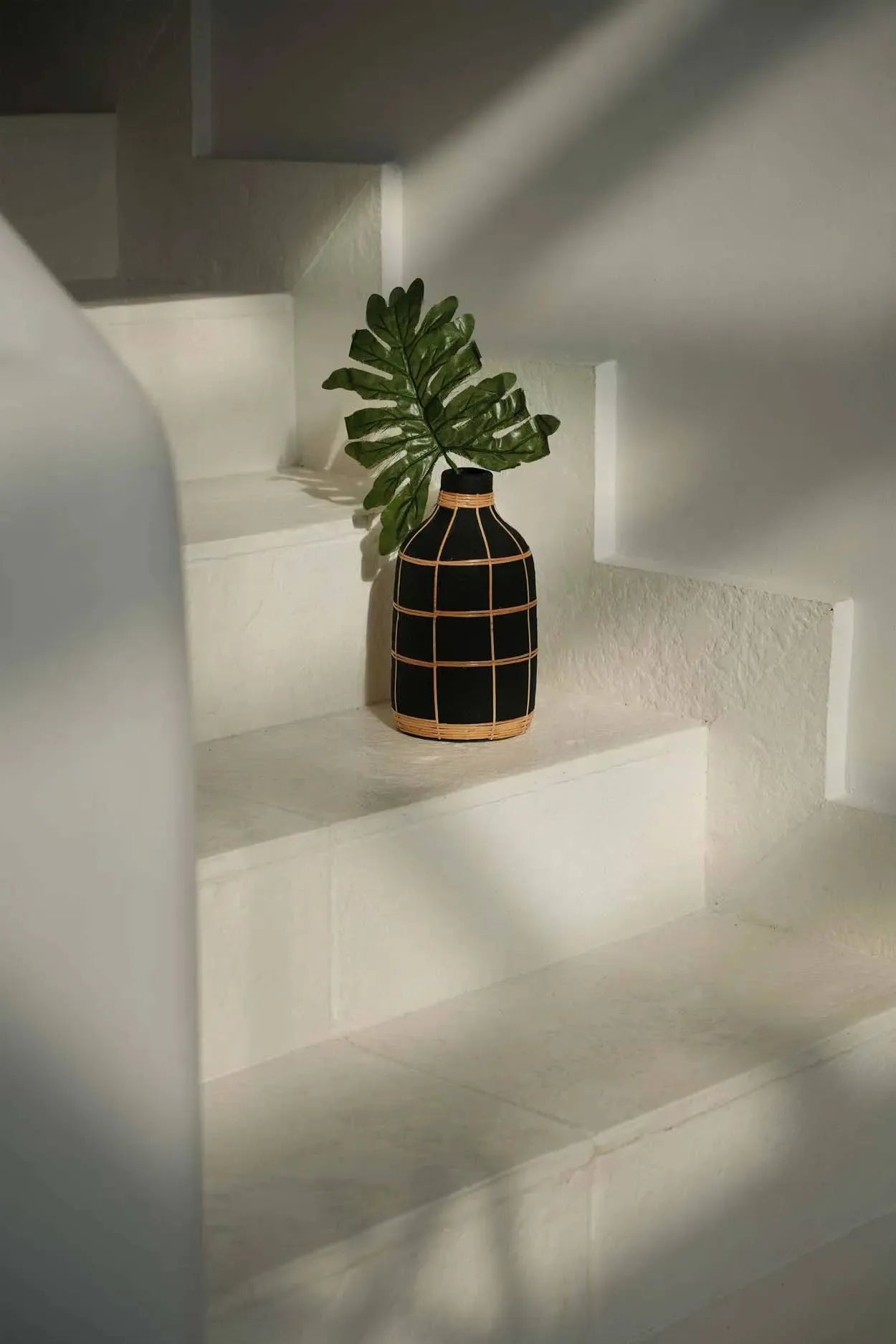 Perfect voor droogbloemen of gewoon als decoratie - deze gebogen vaas is een absolute topper. Verkrijgbaar in drie maten. Het rotan detail geeft een instant kustgevoel aan uw woonkamer, badkamer of overdekte buitenruimte.Let op: dit isgeen waterdichte vaasen mag alleen worden gebruikt met droge bloemen.