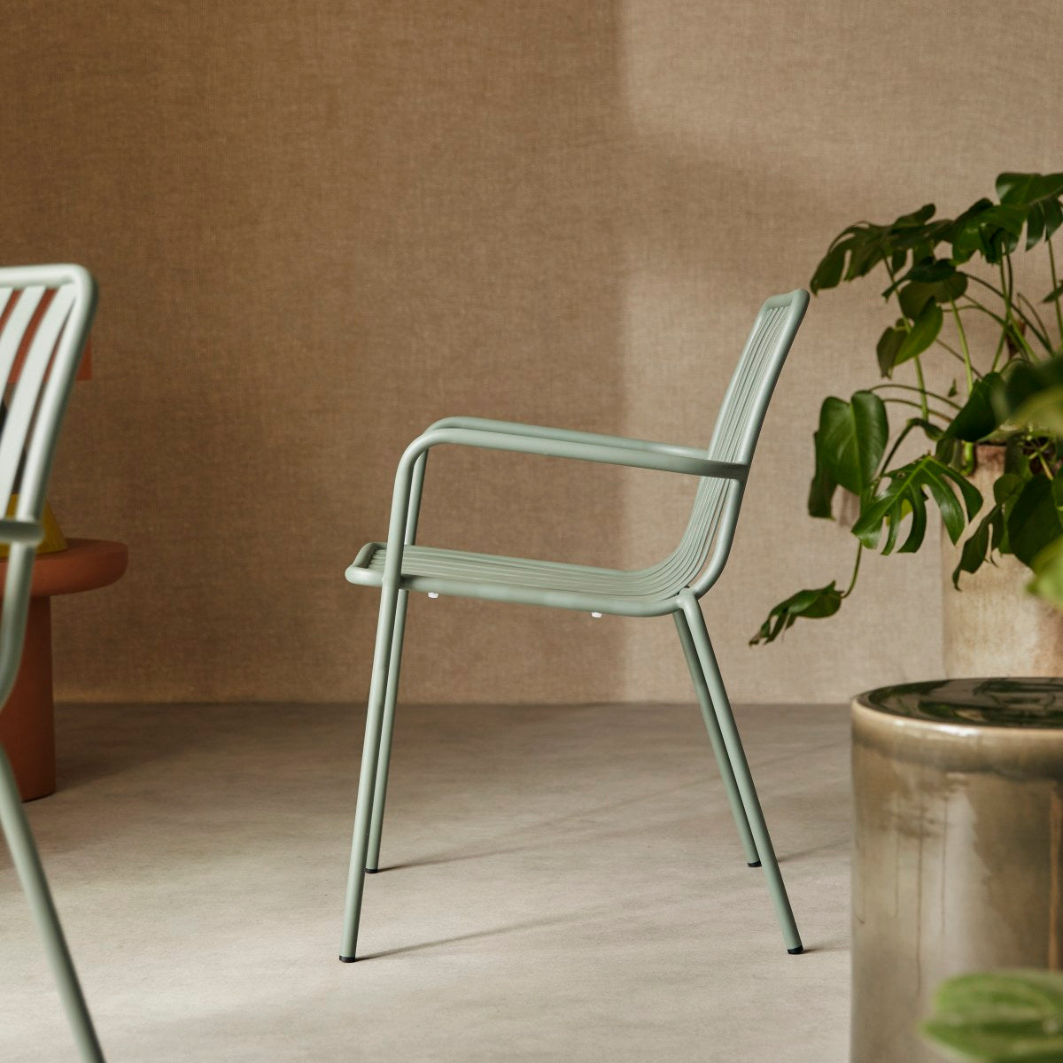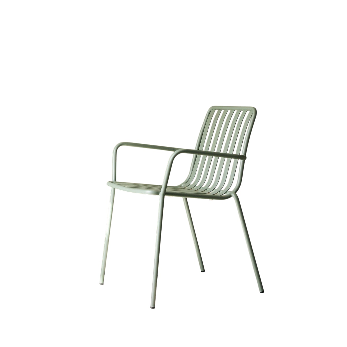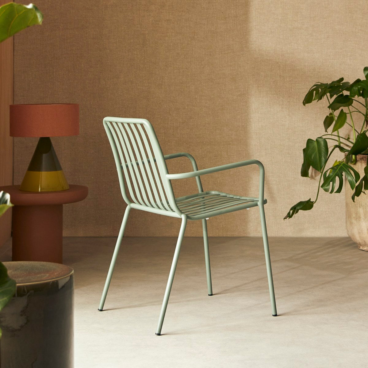 Met zijn groene kleur brengt de metalen Gaby fauteuil zowel in huis als buiten een fris accent. Hij is mobiel en stapelbaar en past dan ook in elke woonruimte, van de woonkamer tot het terras.