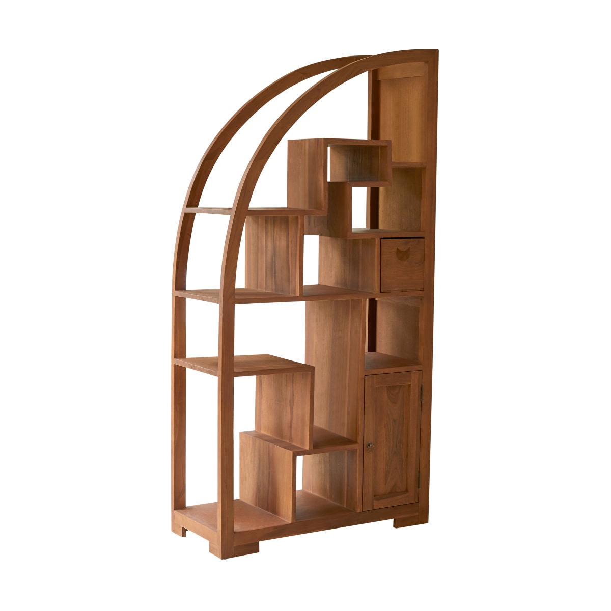 Laat u verleiden door de afgeronde lijnen van deze boekenkast van massief teakhout. De originaliteit van het ontwerp introduceert een nieuwe stijl in uw interieur. De Zen Alco Tipo boekenkast van teak heeft vele planken voor uw boeken, cd's en andere items.