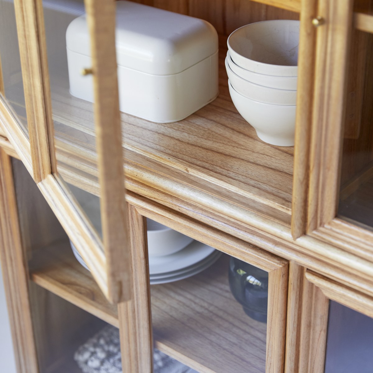De dubbele vitrinekast Alex heeft een mooie, tijdloze elegante uitstraling, met veel opbergruimte... of om uw mooiste voorwerpen in de kijker te zetten! En het lichte natuurlijk mindihout is prachtig. De zachte lijnen maken er een eenvoudig mooi meubelstuk van.
