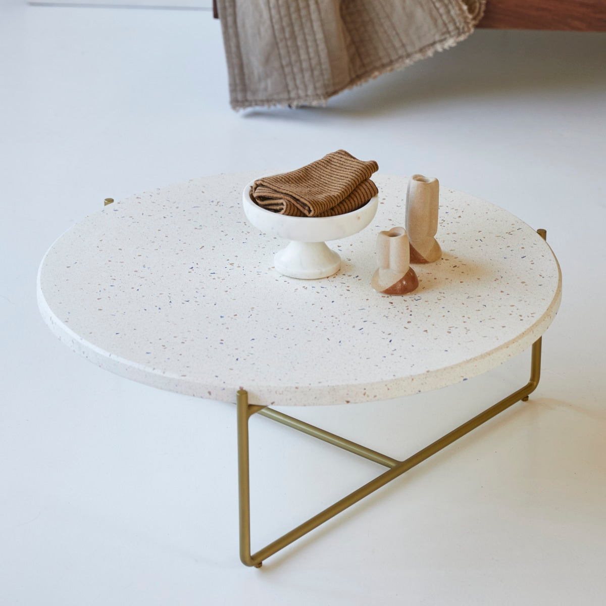 De 80 Anatole salontafel van metaal en terrazzo is ook verkrijgbaar in grijs.