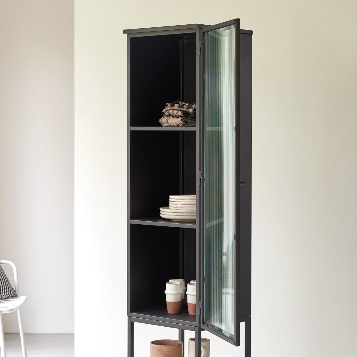 De metalen kolomkast Antonin is geïnspireerd op de werkplaatsen uit het begin van de twintigste eeuw, heeft een tijdloos ontwerp en is met zorg vervaardigd. Hij bereikt de perfecte balans tussen glad metaal dat wordt beschermd door een poedercoating (die het strakke uiterlijk van het metaal niet uitvlakt) en doorschijnend gehard glas. Let op de elegantie van de glazen deur, die gesloten blijft dankzij slim geplaatste magneten, de subtiele handgreep en, aan de onderkant, de nis voor het uitstallen van uw mooiste decoratieartikelen, tijdschriften, een paar boeken...