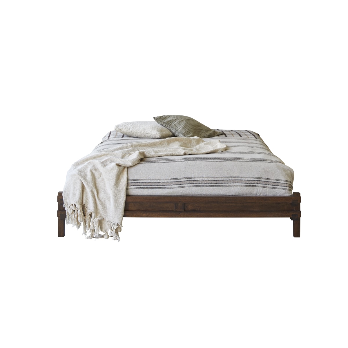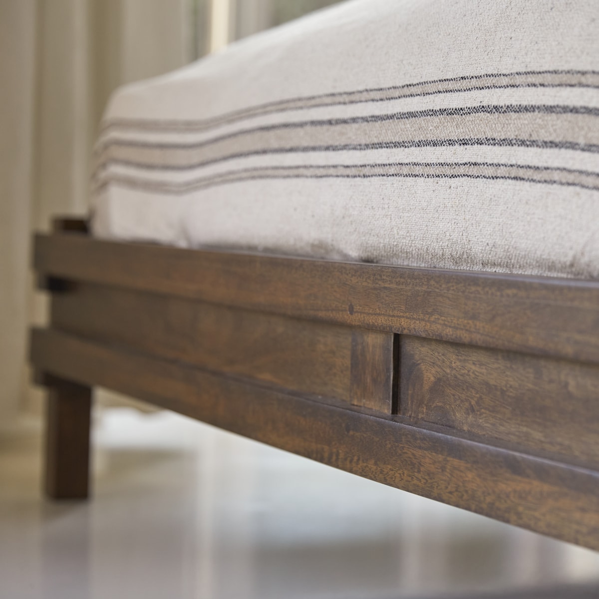 Als een uitnodiging om te reizen haalt het Arko bed in massief mangohout zijn inspiratie uit verre oorden om een neo-etnische sfeer in de slaapkamer te creëren. We houden van de genuanceerde kleur met glinsterende accenten en de natuurlijke schoonheid van het hout dat gelakt is voor dagelijks gebruiksgemak.