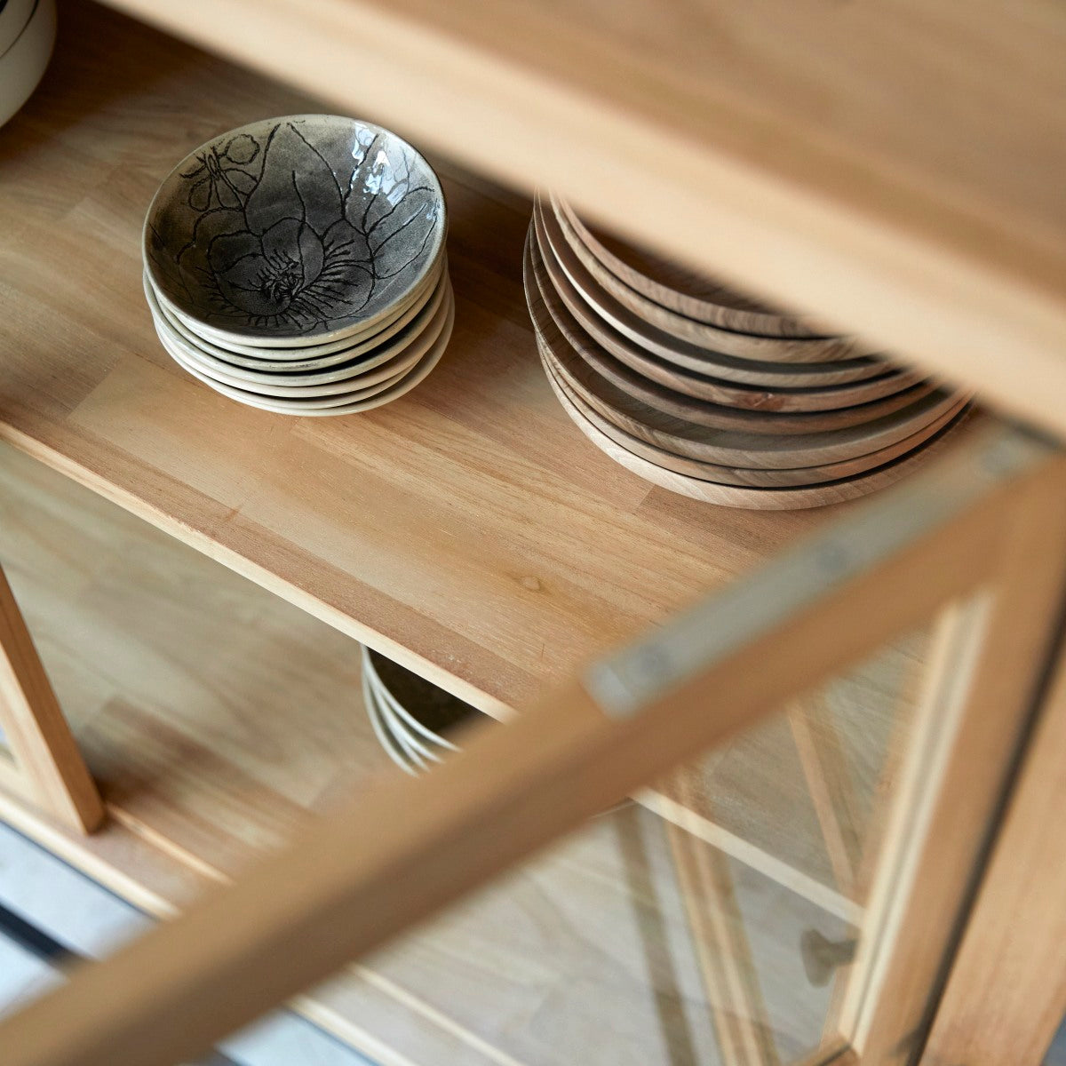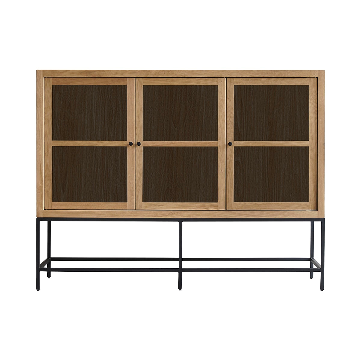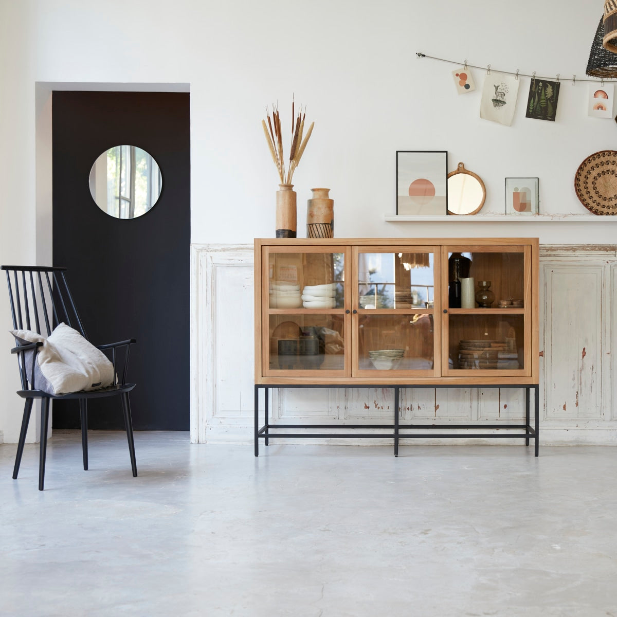 We houden van de blonde kleur van het onbehandelde hout dat een groot aantal stijlen mogelijk maakt, en de visuele lichtheid van het metalen onderstel. U kunt een mooi decoratief hoekje creëren door boeketten, planten, lampen en andere mooie voorwerpen bovenop de servieskast te plaatsen...