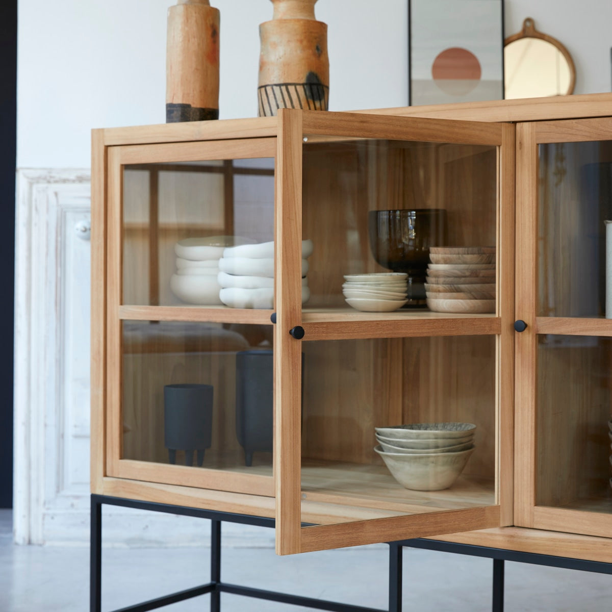 De lage vitrinekast Babeth in teak is de perfecte combinatie van tijdloze charme, moderne lijnen en design. Een meubel dat u in elke kamer van het huis even succesvol kunt plaatsen: in de eetkamer, in de keuken en in de woonkamer, er past serviesgoed en tafellinnen in, in de slaapkamer of bibliotheek kunnen er boeken, decoratieve voorwerpen in, enz.