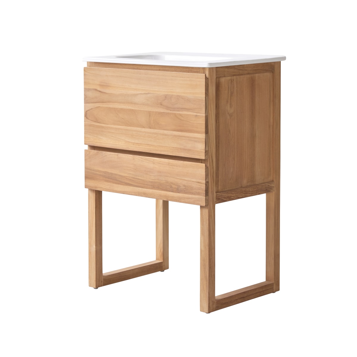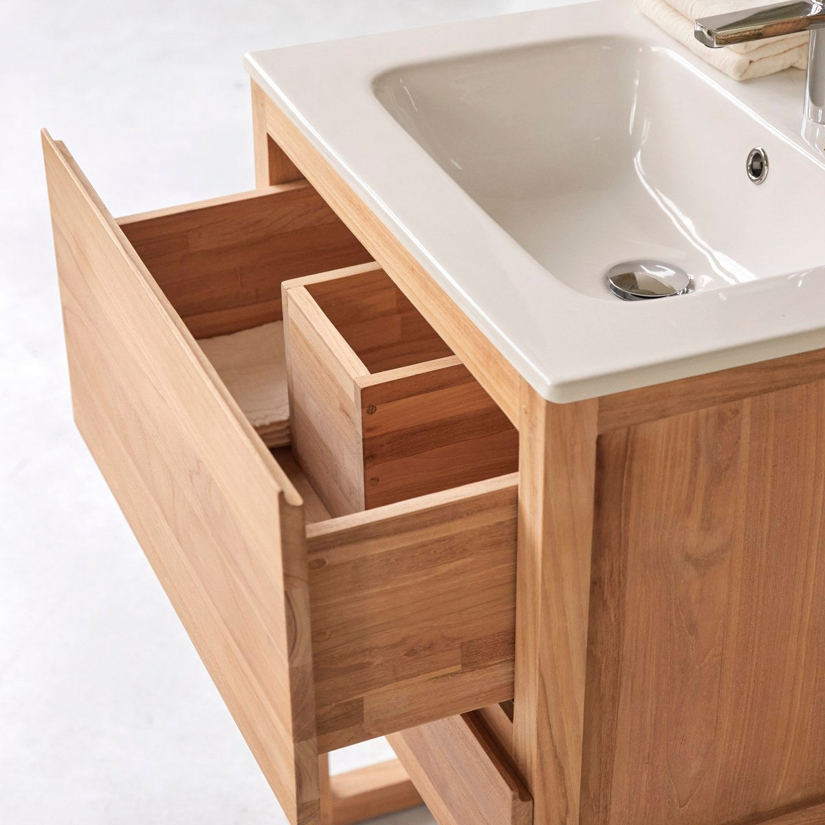 Minimalistische elegantie, natuurlijke charme en een gemakkelijk te combineren lichte kleur... dit badkamermeubel van massief teakhout en keramiek is een tijdloos meubelstuk voor dagelijks gebruik. De erg praktische lades zijn zo ontworpen dat u de inhoud in één oogopslag kunt zien.