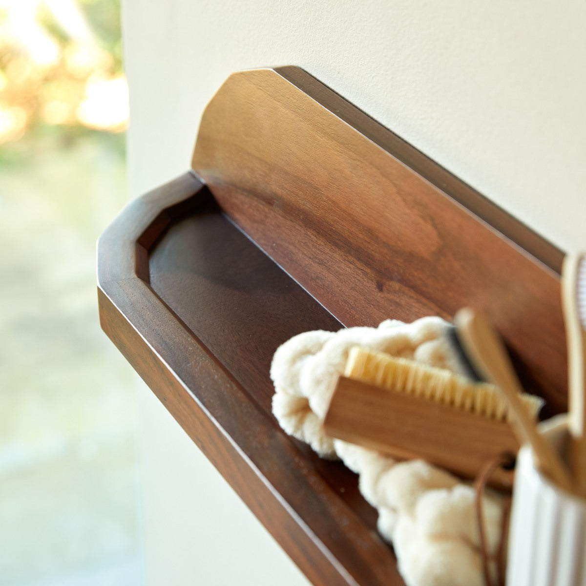 De grafische en praktische Jade wandplank in massief palissander is ideaal voor de badkamer. De royale afmetingen, het kostbare hout met contrasterende nerven en het centrale tussenschot bieden opbergruimte en stijl.
