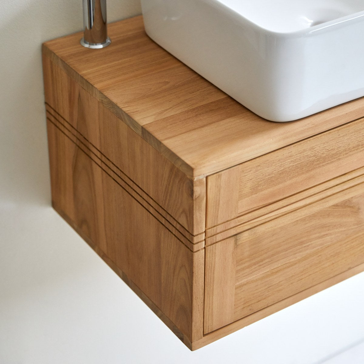 Dit elegante ophang badkamermeubel van massief FSC ®-teakhout is werkelijk onweerstaanbaar!