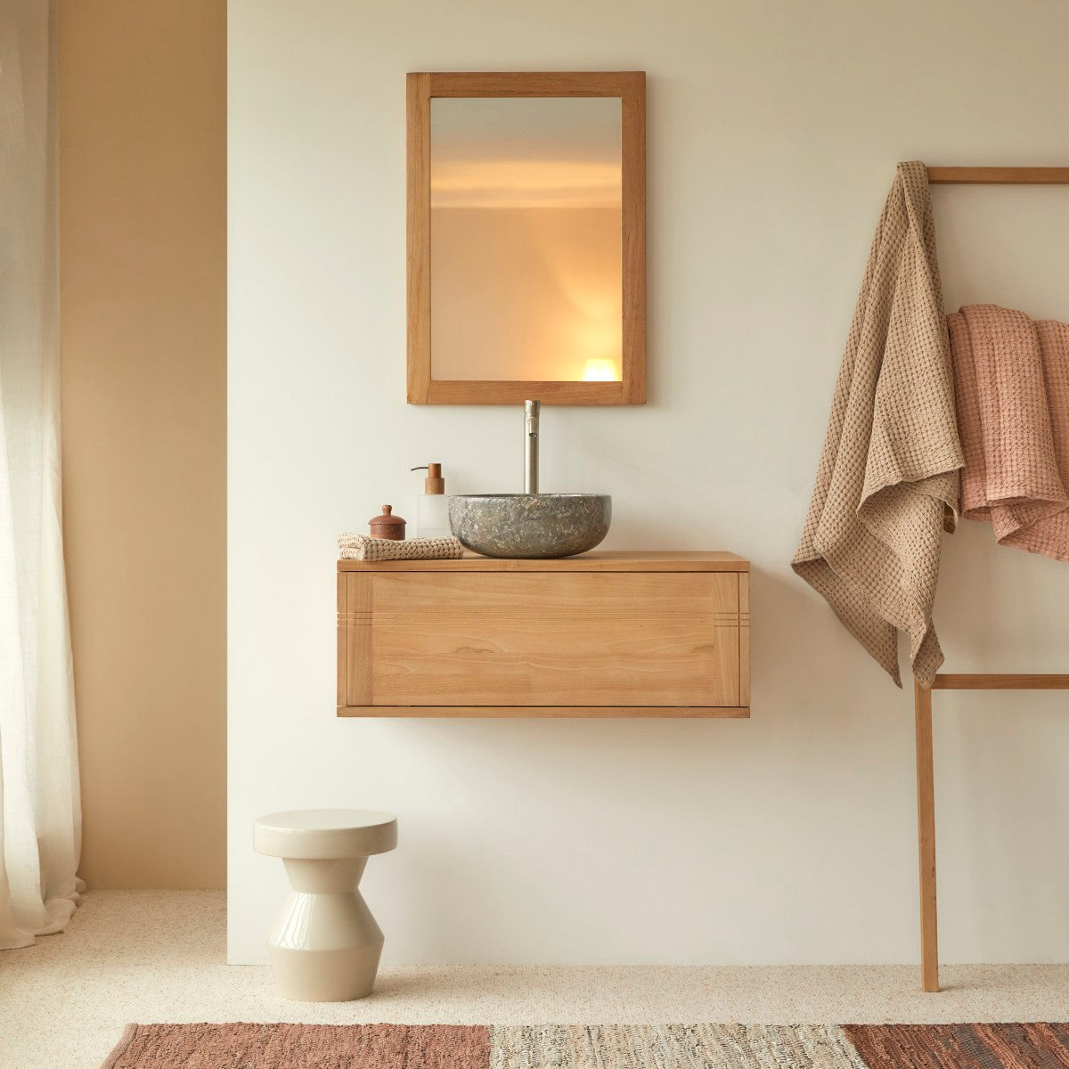 De charme van teakhout gecombineerd met de soberheid van de ontwerplijnen maken van uw badkamer een plek met een natuurlijk karakter.