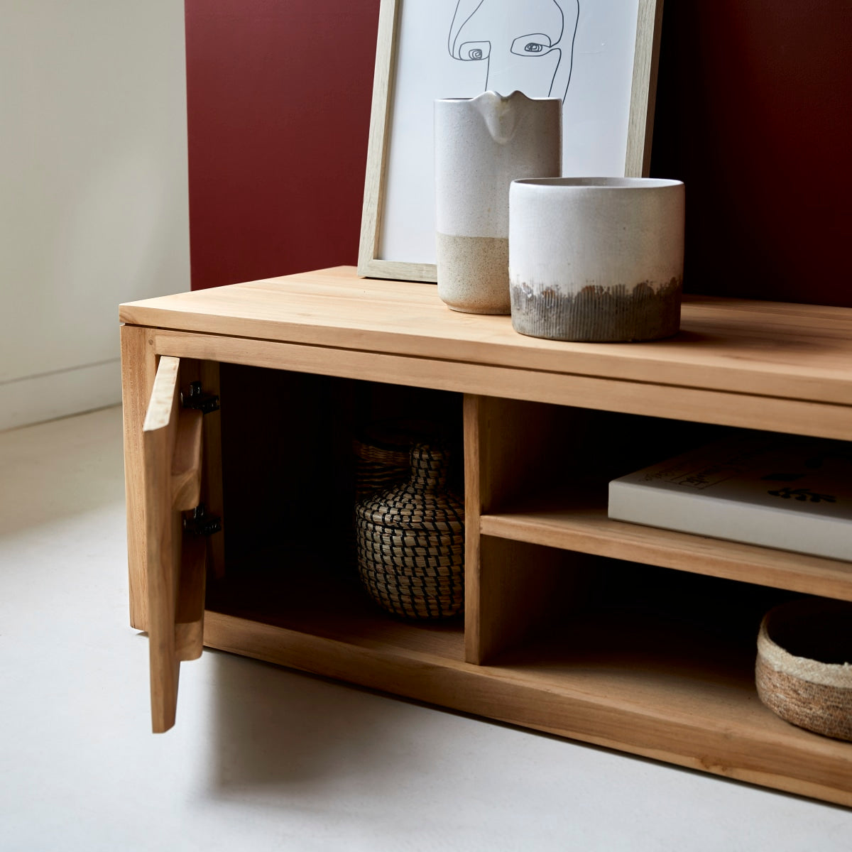 Dit tv-meubel van teakhout met moderne lijnen biedt alle nodige opbergruimte voor uw woonkamer. Dit tv-meubel heeft 2 scharnierende deuren met achter elke deur een gesloten opbergruimte en bovendien heeft het 2 centrale open vakken. Dankzij zijn lengte van 140 cm kunt u probleemloos een scherm of andere multimedia-apparatuur installeren. Voor een harmonieus en natuurlijk interieur raden we aan de inrichting te completeren met een salontafel uit onze catalogus ...