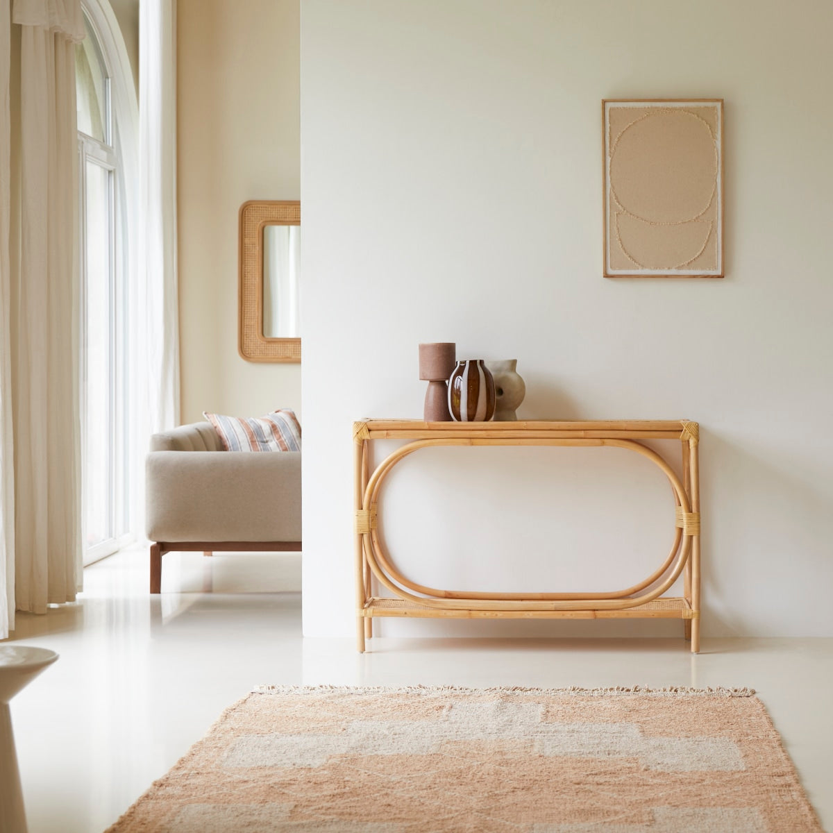 Zijn zachtheid voegt een warme toets toe aan uw inrichting, terwijl zijn authenticiteit wordt geaccentueerd door het gedetailleerde vakmanschap van het vlechtwerk en de natuurlijke kleur.
