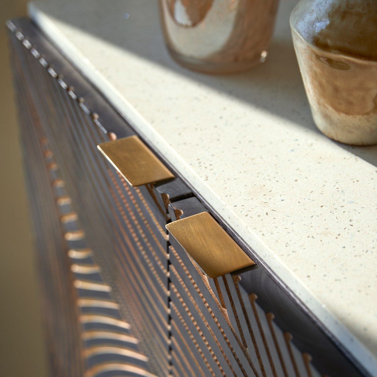 Een meubelstuk als collector’s item: het dressoir van massief mangobord Bilal betovert door de schoonheid van het houtsnijwerk dat de deuren versiert! Met zijn exotische invloeden voegt het een vleugje rariteitenkabinet toe aan uw huis. We houden van het massieve hout dat zo kenmerkend is voor exotische meubelen en het terrazzo blad waarop u bijvoorbeeld groene planten kunt zetten zonder het meubel te beschadigen. We houden ook van de originele, onopvallende handgrepen en het frame met messinglook, dat het geheel optisch verlicht. Het is ideaal voor in de woon- of eetkamer om serviesgoed of andere accessoires in op te bergen, maar past ook prima in een ruime hal. Afgewerkt met getinte lak.