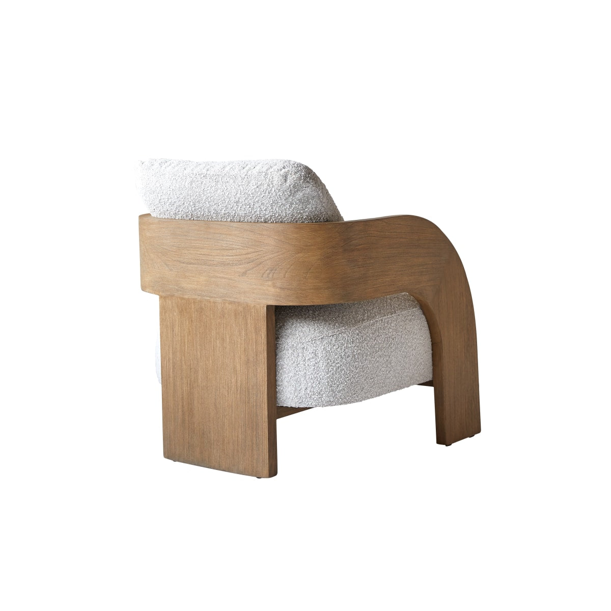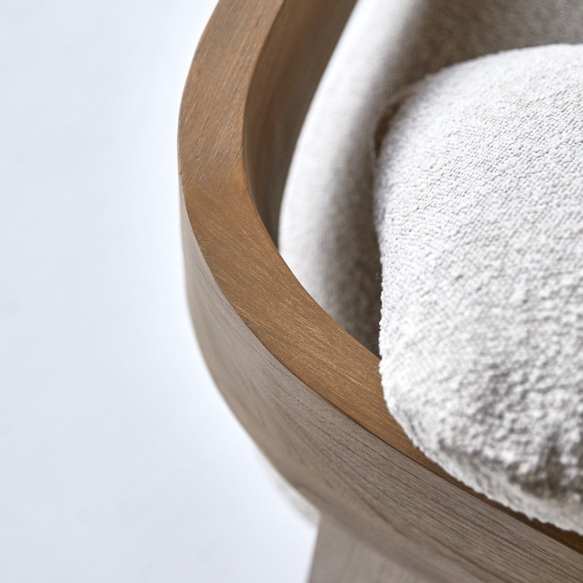 De Boti fauteuil in massief mindihout en bouclé stof is verkrijgbaar in de versie stoel Boti.