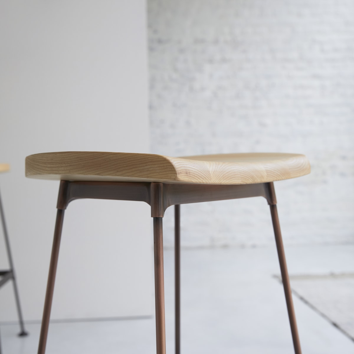 Alsof hij rechtstreeks uit een fabriek uit de jaren 1930 komt, heeft de hoge kruk Copper van metaal en essenhout alle goede punten van een industrieel geïnspireerd meubelstuk: Het model is functioneel, mooi en laat een geslaagde combinatie zien van twee normaal gesproken tegengestelde materialen, hout en metaal.