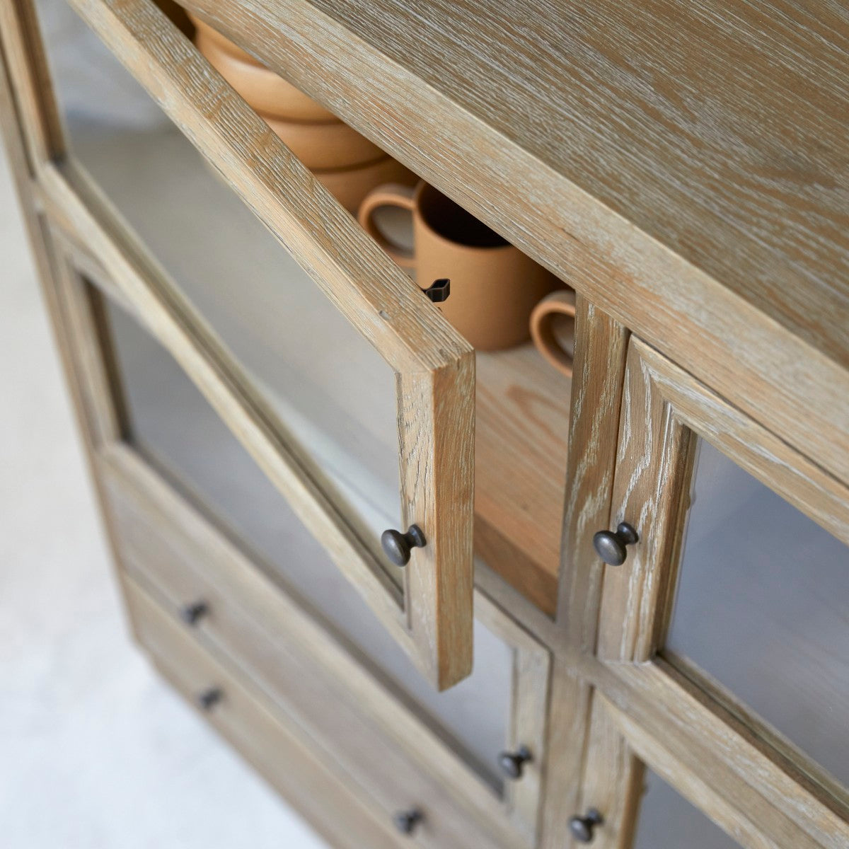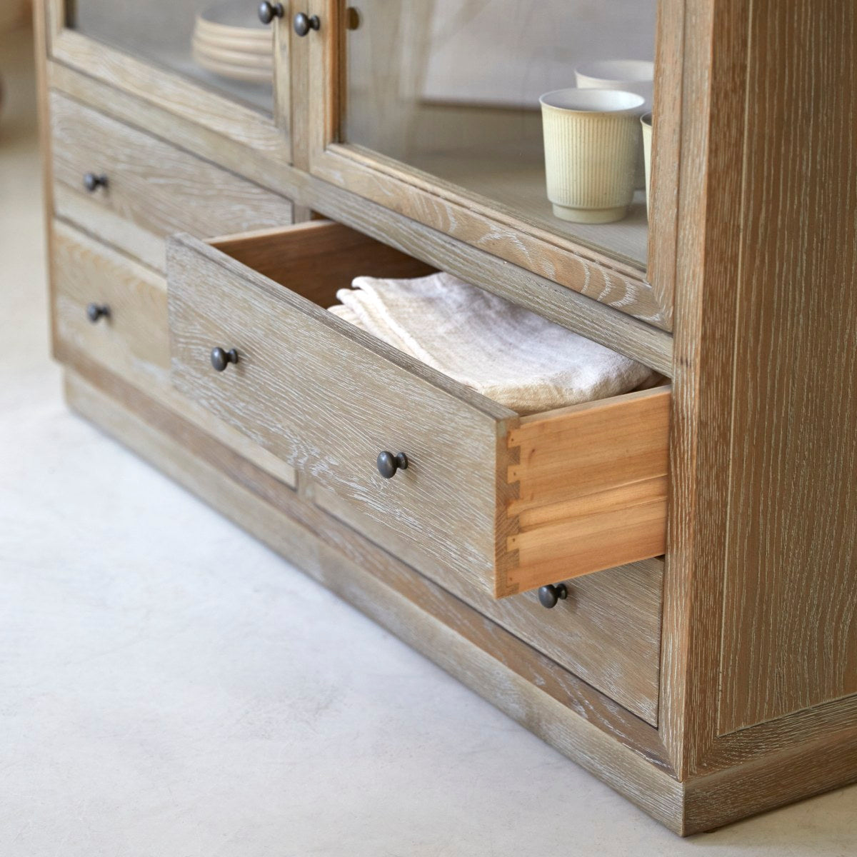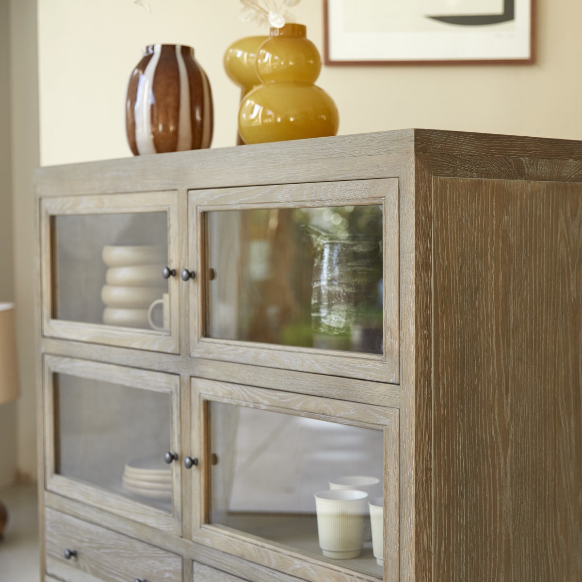 Geïnspireerd op antieke meubels, met een praktische indeling; u kiest voor de combinatie van lades en deuren met glas om uw eetkamer te organiseren.