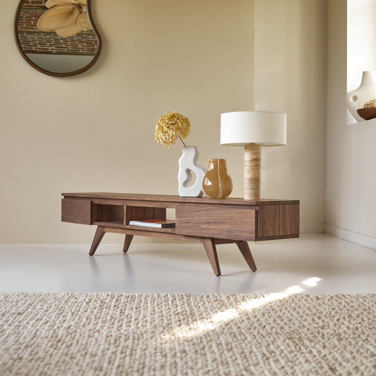 het Esmée tv-meubel van massief notenhout zal u verleiden met de kwaliteit van het edele hout, de gouden accenten en de mooie zichtbare nerven en de minimalistische lijnen met tijdloze charme. Ideaal in alle woonkamers ongeacht de stijl, het maakt ook een Scandinavisch geïnspireerde decoratie schitterend af. Samengesteld uit 2 vakken en 2 grote laden om alle multimedia-accessoires te organiseren en ruimte op de bovenste plank voor de televisie en andere grotere apparaten.
