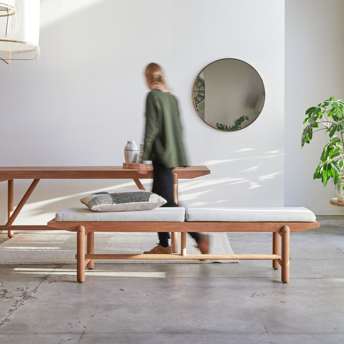 Outdoorstijl vindt zijn weg naar binnen: met de Fado-bank van massief teakhout creëert u een sfeer als in een wintertuin! Een trend die erg in de mode is bij hedendaagse ontwerpers! Deze prachtige bank is gemaakt van gelakt hout dat bekend staat om zijn weerstand tegen dagelijkse ongelukjes, slijtage en verwering. Zijn lattenbodem is een super hip, zorgvuldig gemaakt designelement, de kussens zijn afneembaar en machinewasbaar. In combinatie met de massief teakhouten tafel Fado, creëert u een eethoek vol karakter die u ook in de tuin kunt plaatsen.