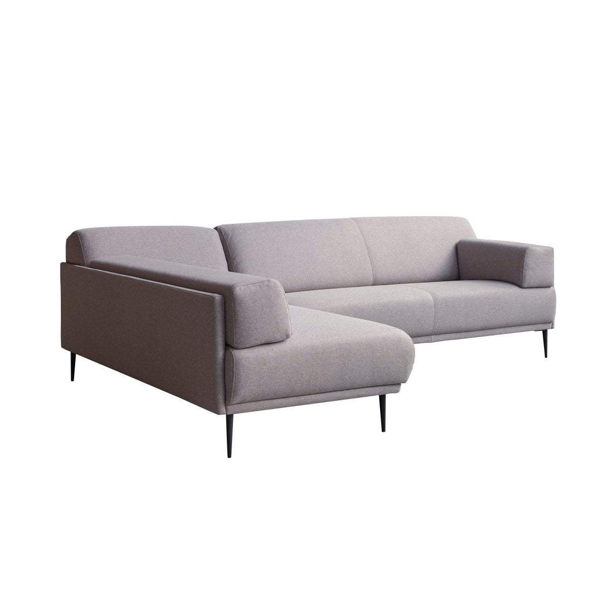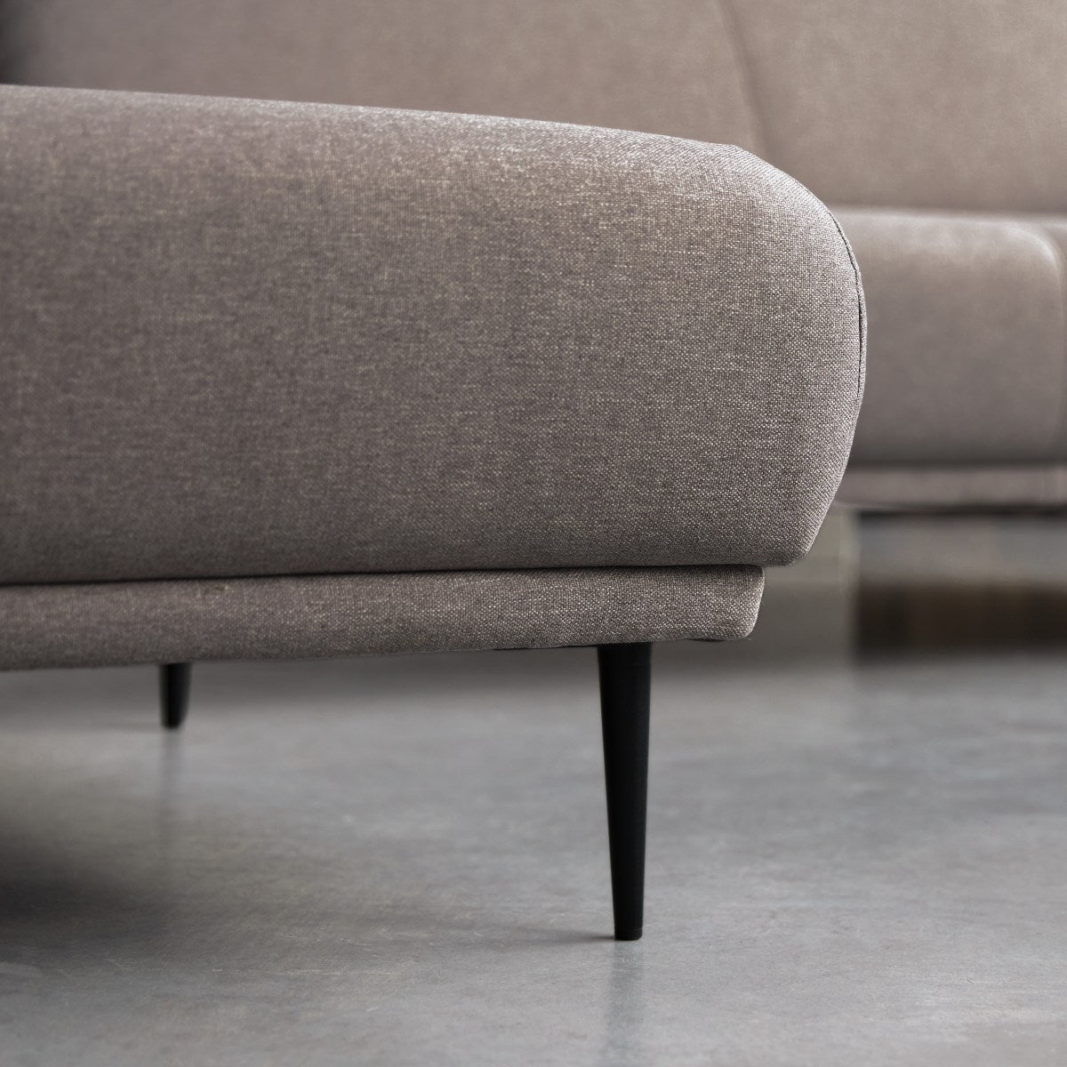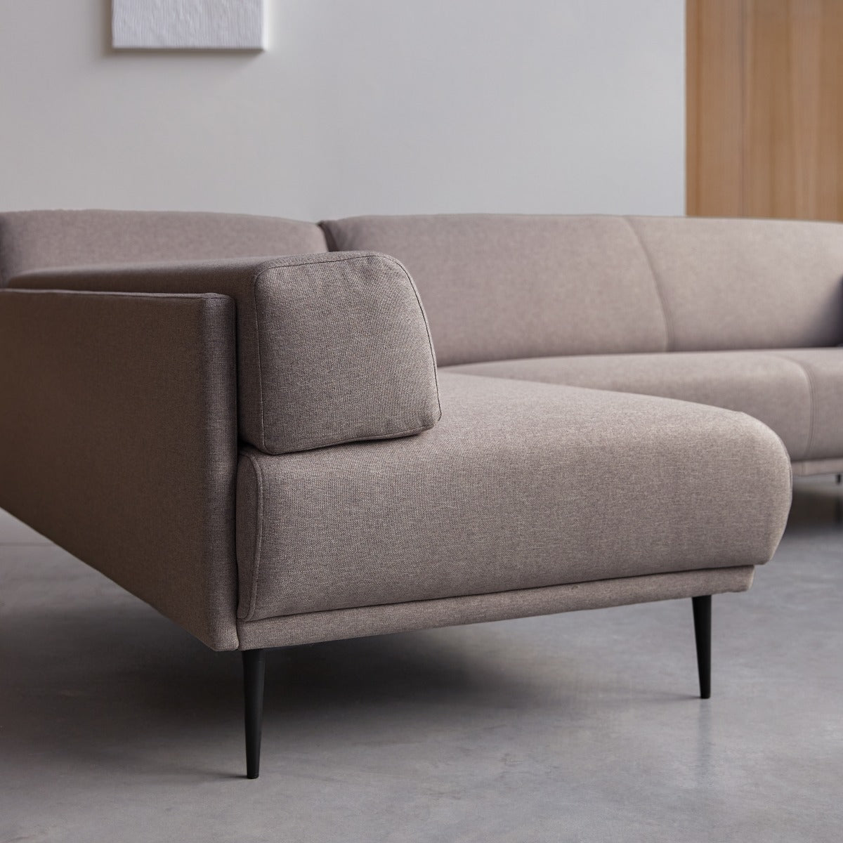 Met zijn sobere lijnen en geraffineerde taupegrijs kleur is de hoekbank links Finn met interieurs in elke stijl te combineren. Hij staat centraal in uw woonkamer en kan naar wens worden opgevrolijkt met een of twee kleurige kussens...
