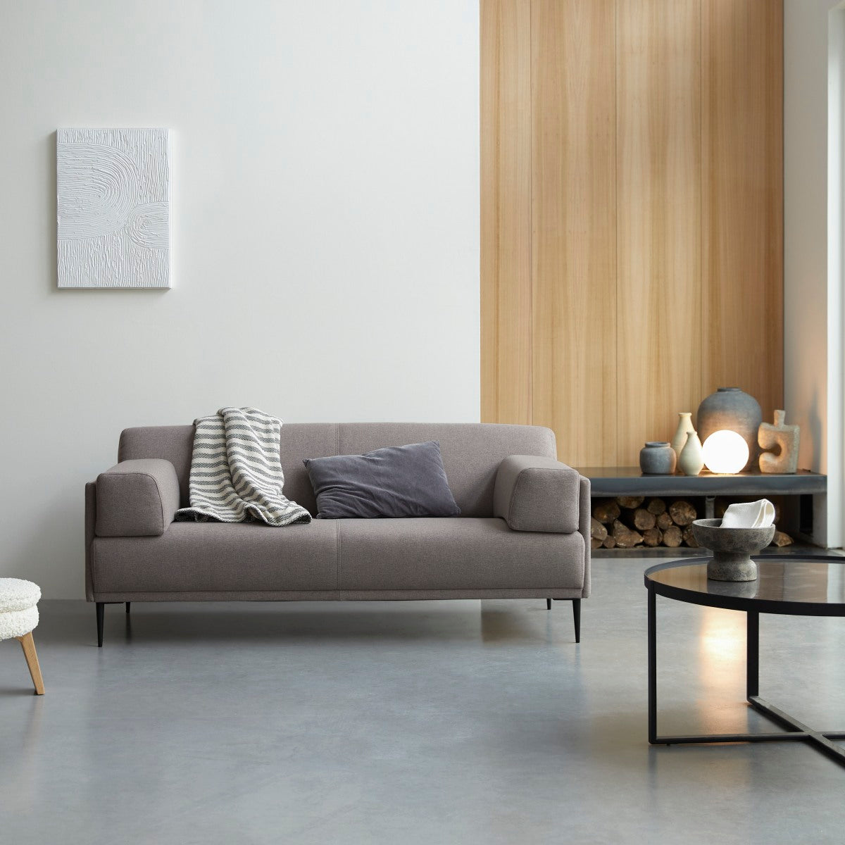 Met zijn sobere lijnen en natuurlijk elegante grijze kleur heeft de bank Finn alles om u voor zich te winnen! Hij is niet alleen ruim, maar ook zeer comfortabel en kan naar wens worden omgevormd: laat de twee armkussens gewoon weg voor een ultra-minimalistische bank... en voeg ze toe voor een gezelligere bank. Hij is gemaakt van een OEKO-TEX® gecertificeerd estof, dus gegarandeerd vrij van schadelijke stoffen of chemische producten. Hij heeft elegante metalen poten die hoog genoeg zijn om met een bezem onder het meubilair door te vegen.