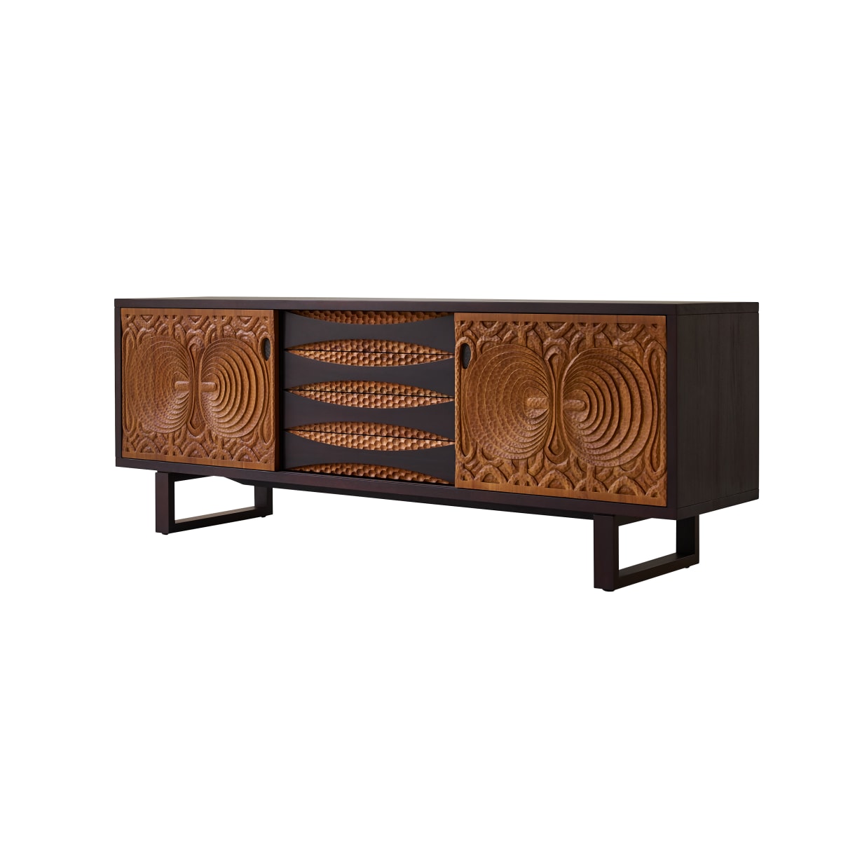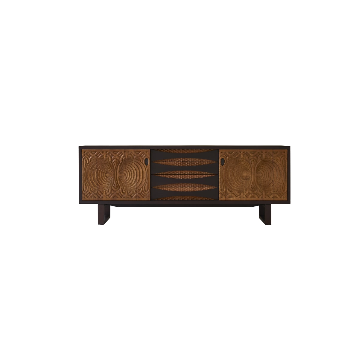 De voorkant is bewerkt met fijn houtsnijwerk met atypische en etnische vormen die het model super authentiek maken. Een prachtig stuk met een unieke, exotische en originele uitstraling. De wengékleur creëert een een warme en exotisch sfeer in uw kamer.