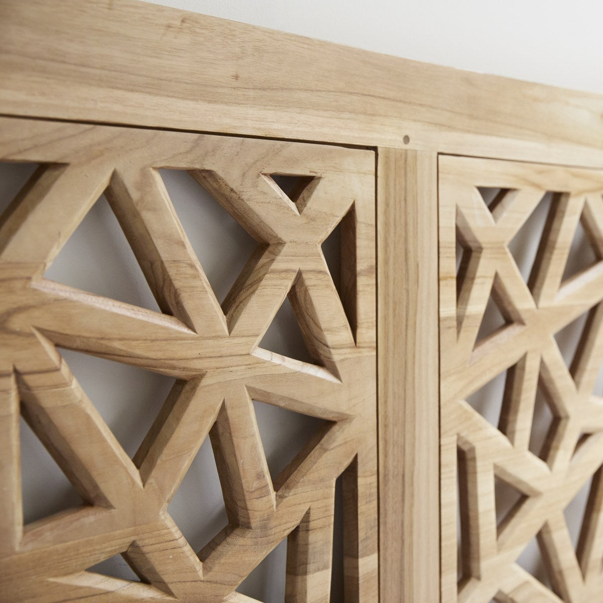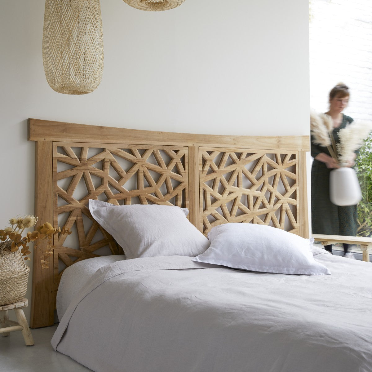 Bijna een kunstwerk: elk stuk is uniek! Het Gentong massief teakhouten hoofdbord is volledig met de hand gesneden door ambachtslieden met uitzonderlijke vaardigheden. Gemaakt van een natuurlijk nobel en robuust hout en geïnspireerd door verre horizonten om hét decoratiestuk van de slaapkamer te worden. Dit prachtige hoofdbord waakt elke dag over u tijdens het inslapen en weer wakker worden. Gemakkelijk te installeren in elke slaapkamer en de lichte kleur laat allerlei stijlcombinaties toe… Het Gentong massief teakhouten hoofdbord maakt deel uit van onze Néo Ethnique-collectie, een serie meubels waarmee u op reis gaat zonder uw huis te verlaten!