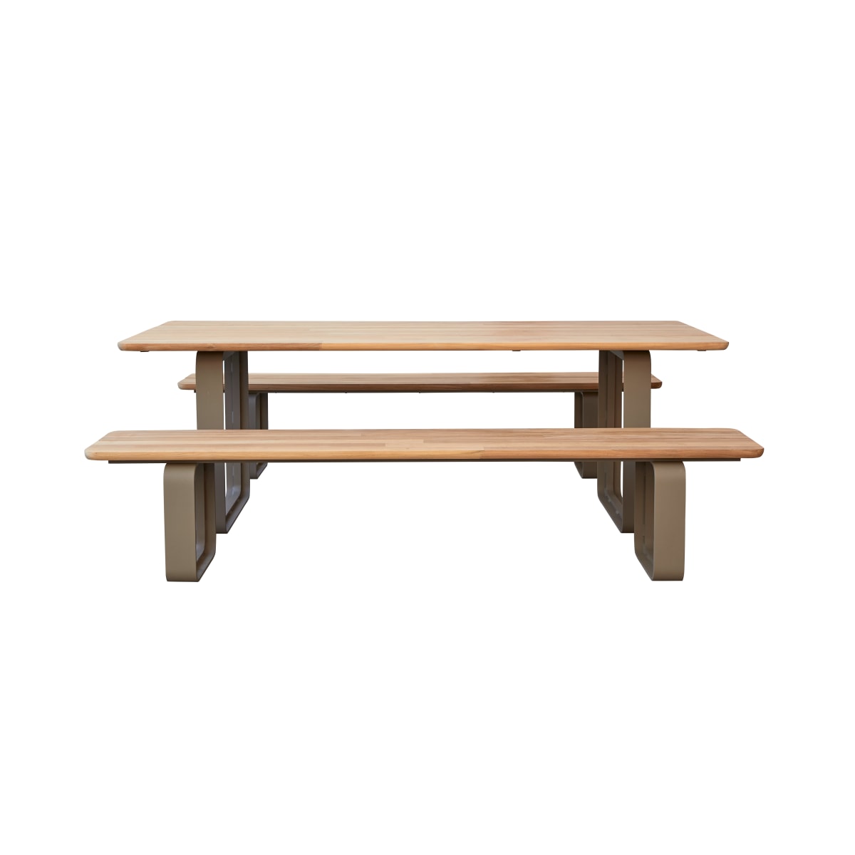 Een hoogwaardige set van 3 meubels met een eigentijds en licht industrieel ontwerp. Nu het huis zich opent naar de tuin en deze de rol aanneemt van extra leefruimte, is het belangrijk om deze plek zo in te richten dat het een plezier is om er seizoen na seizoen naar terug te keren! Deze kwalitatieve set bestaat uit 2 banken en een tafel van teak en aluminium. De set speelt perfect met het contrast van de materialen en de perfectie van de details.