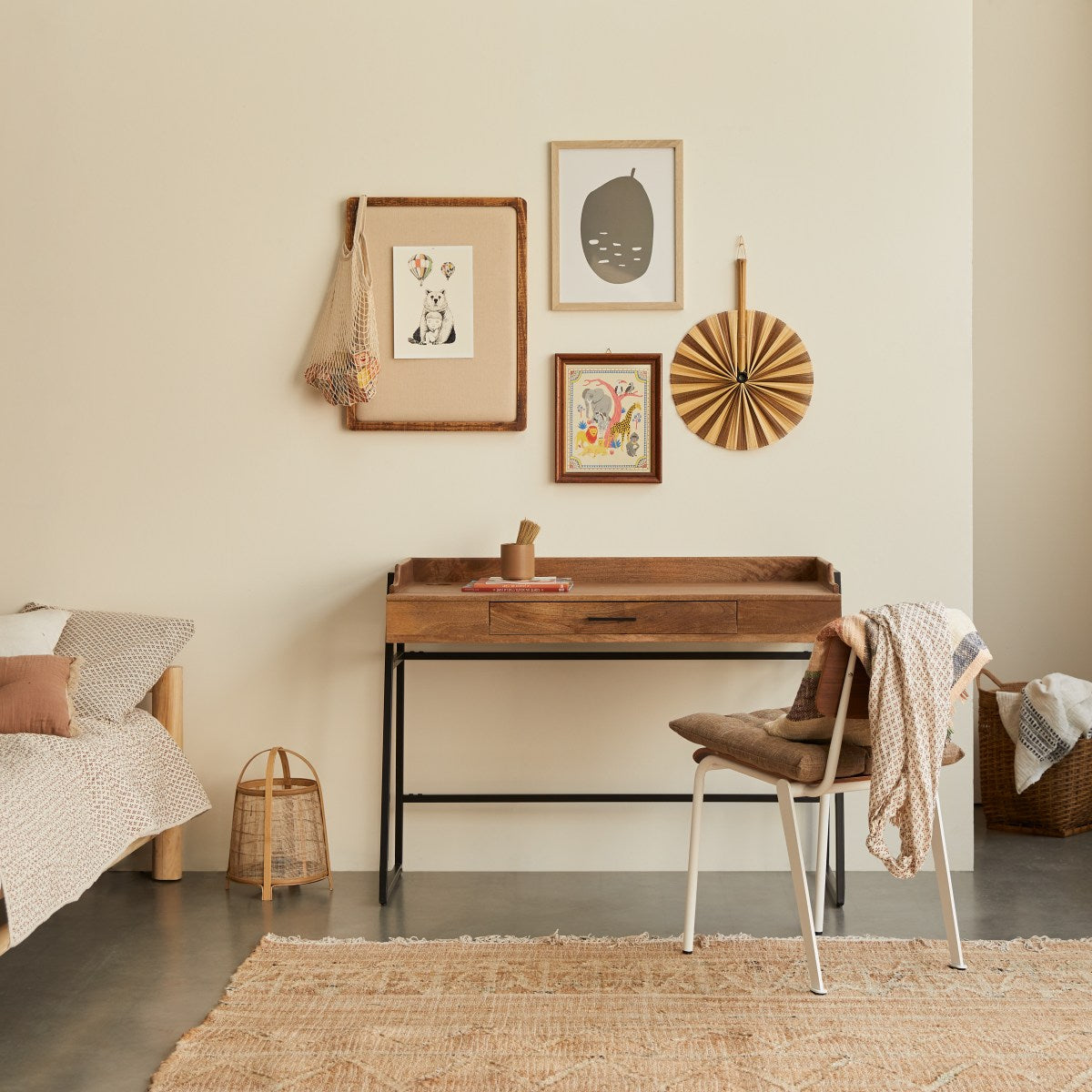 Op het Hedda-bureau van massief mangohout en metaal kunnen kinderen tekenen, knippen, plakken en spelen dat ze de wereld ontdekken - kortom, hun creativiteit uiten! Dankzij de lade, waarin ze ook hun kleine schatten kunnen verbergen, hebben ze hun spullen altijd bij de hand. Oudere kinderen maken er graag hun huiswerk of schrijven er hun eerste gedichten. Ouders zullen enthousiast zijn over het exotisch ogende ontwerp, het geslaagde contrast van de materialen en het gelakte oppervlak dat de houtnerf goed tot zijn recht laat komen. Als aanvulling op het Hedda-bureau van massief mangohout en metaal, presenteren we de Mio-stoel van notenhout en metaal (dit is de stoel op onze foto) of de stoel Ada-stoel van notenhout en metaal. En om uw kind een kamer met exotische accenten te geven, kunt u onze neo-etnisch collectie bekijken.