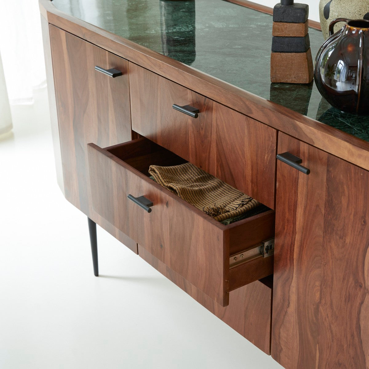 Dit Jade-buffet van massief palissander en marmer is vol persoonlijkheid! Als middelpunt in de eet- of woonkamer brengt het veel elegantie in uw dagelijks leven. We houden van de combinatie van twee edele en visueel zeer sterke materialen: marmer, dat zijn grote comeback maakt in hedendaagse interieurs, en palissander met een grote grafische impact! De gesloten vakken en de grote laden bieden veel opbergruimte.