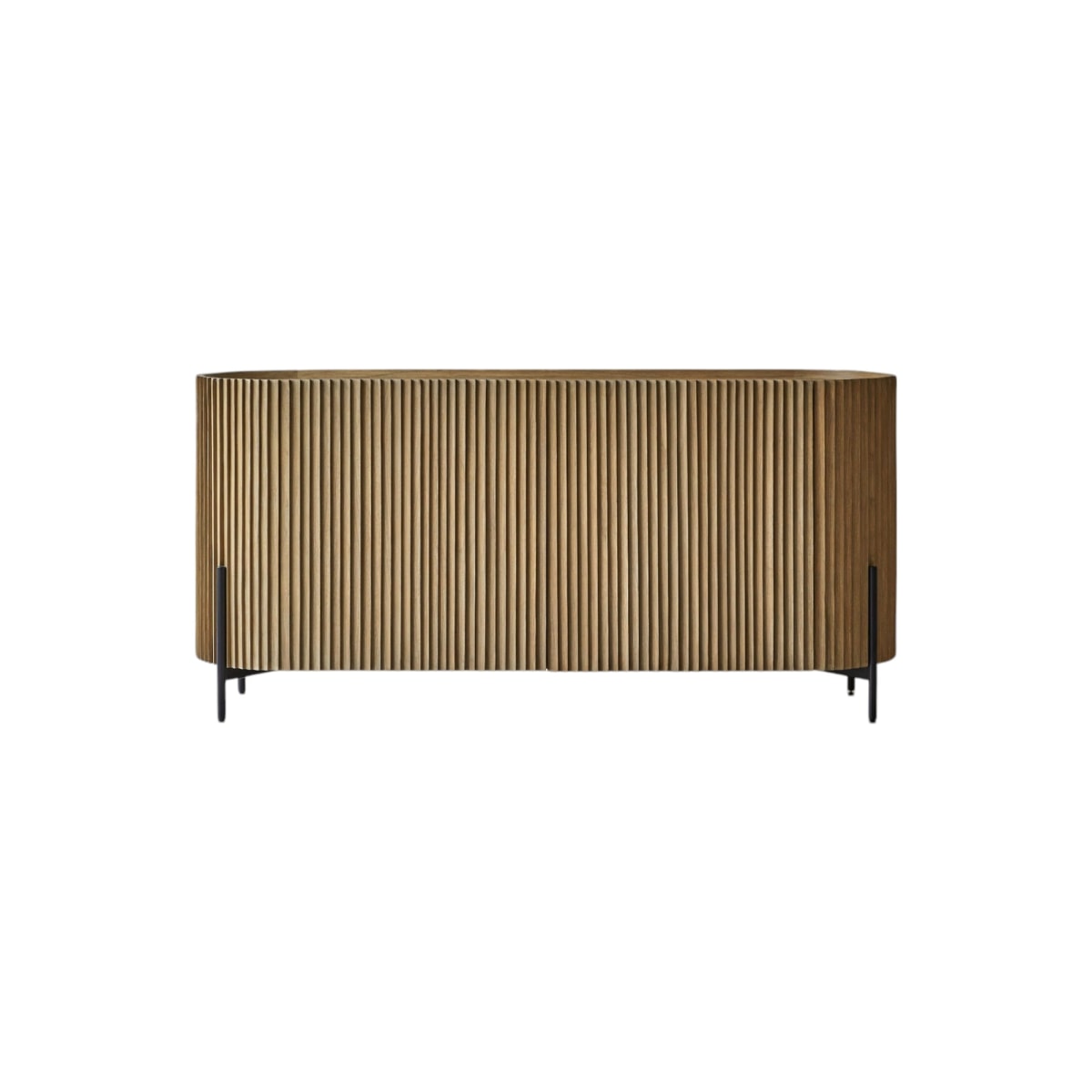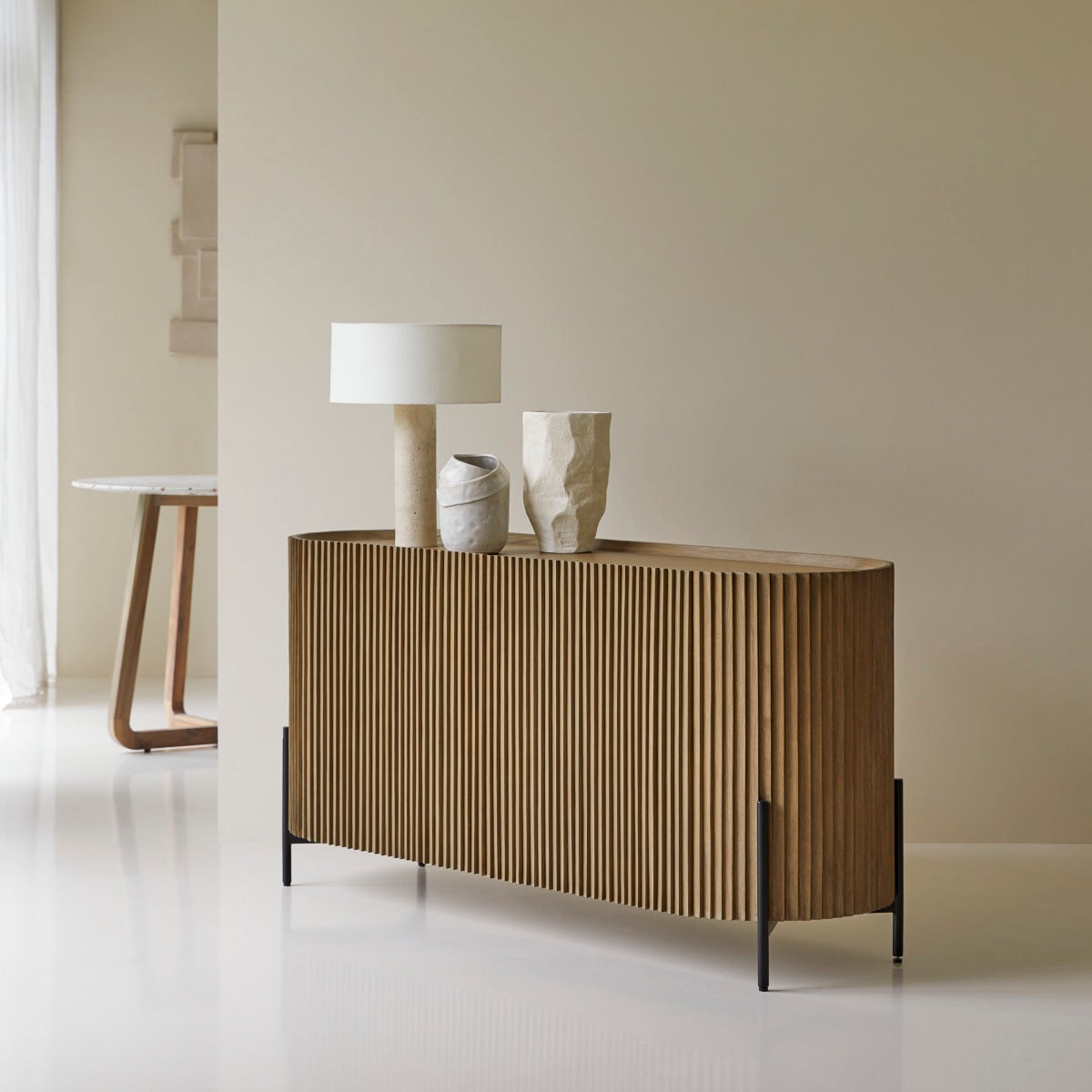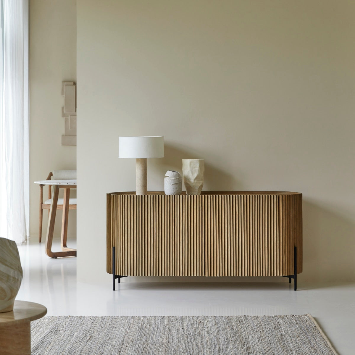 Een vleugje Art Deco voor uw woonkamer, eetkamer, keuken of ... zelfs voor de slaapkamer! Het buffet Lou van gelakt mindihout speelt slim met genres: de afgeronde contour doet denken aan de Roaring Twenties, terwijl het slanke metalen onderstel het meubel een moderne touch geeft.