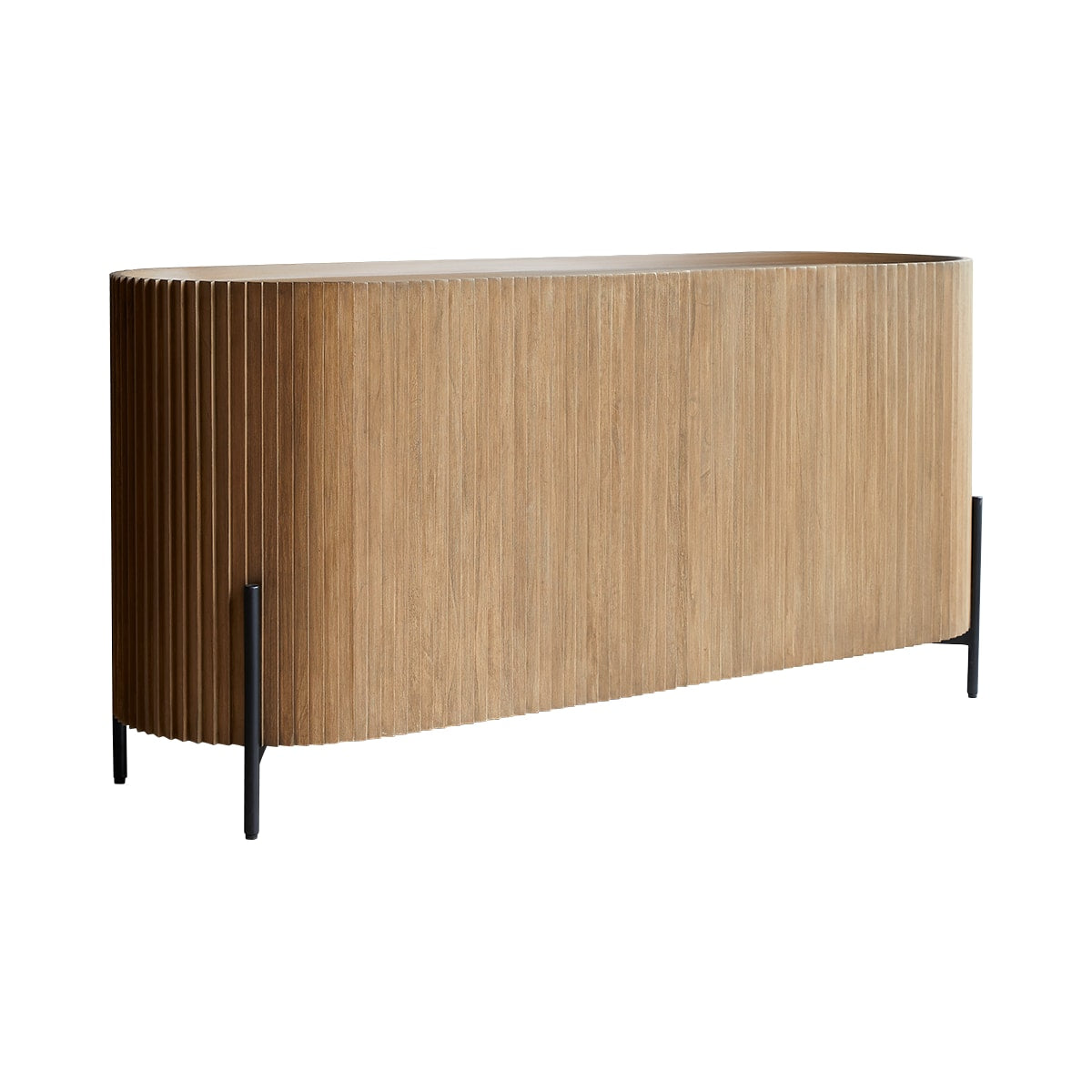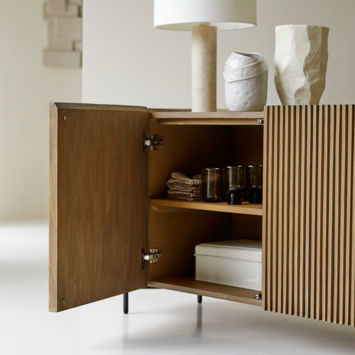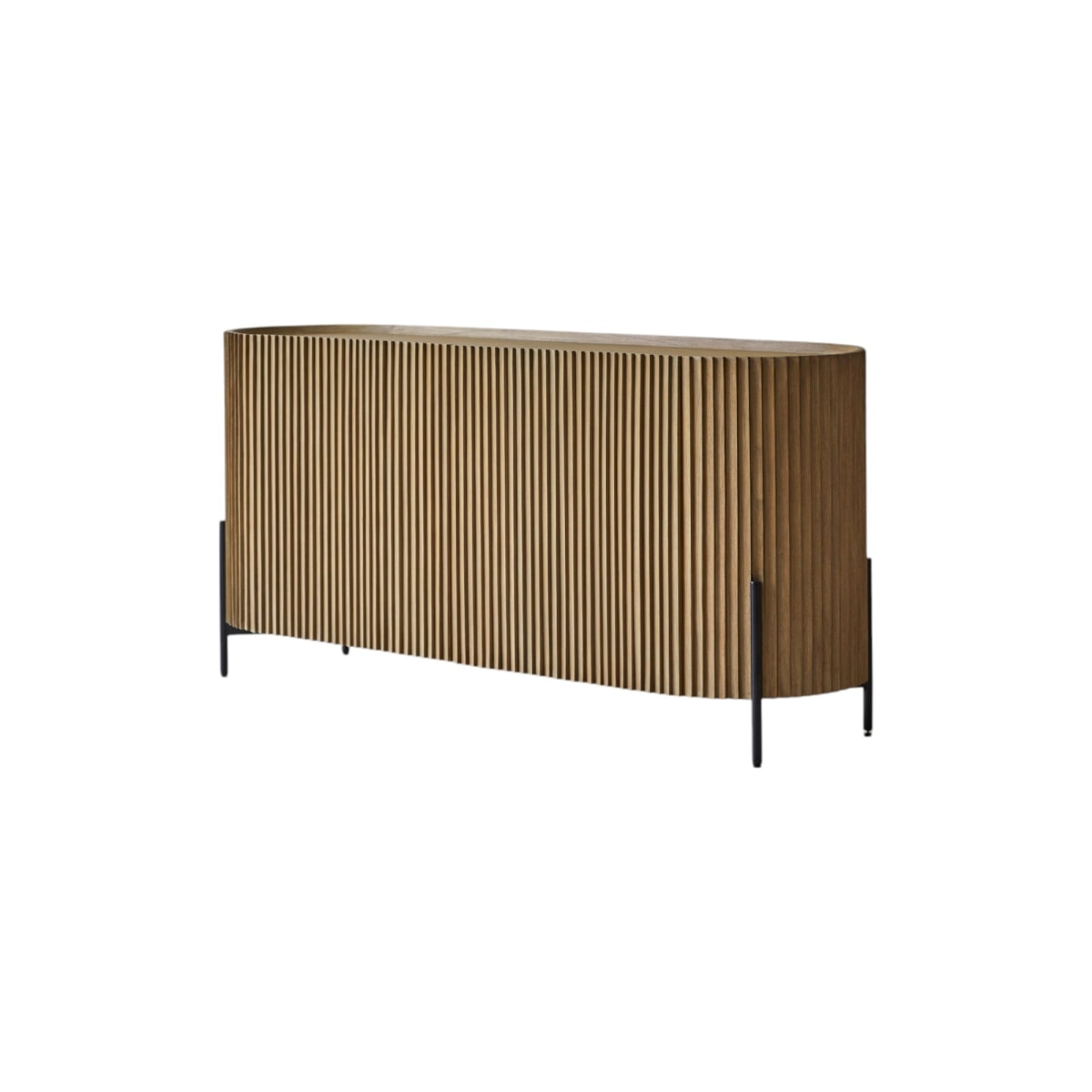 Een vleugje Art Deco voor uw woonkamer, eetkamer, keuken of ... zelfs voor de slaapkamer! Het buffet Lou van gelakt mindihout speelt slim met genres: de afgeronde contour doet denken aan de Roaring Twenties, terwijl het slanke metalen onderstel het meubel een moderne touch geeft.