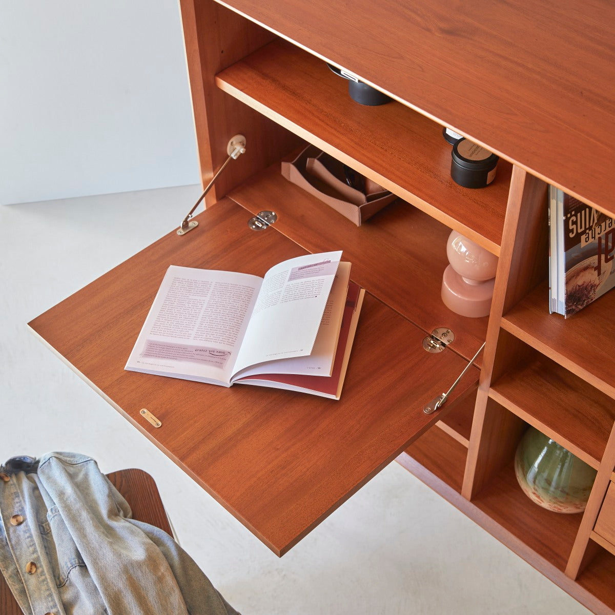 Dit Magda 50's hoge bureau is gemaakt van massief FSC® mahoniehout uit Indonesië. Het heeft een naar beneden scharnierende deur waarachter zich een verwijderbare plank bevindt, waardoor dit opbergmeubel een hoge werkruimte wordt. Dankzij de vele opbergruimtes kunt u al uw documenten, tijdschriften en boeken kwijt in dit bureau.