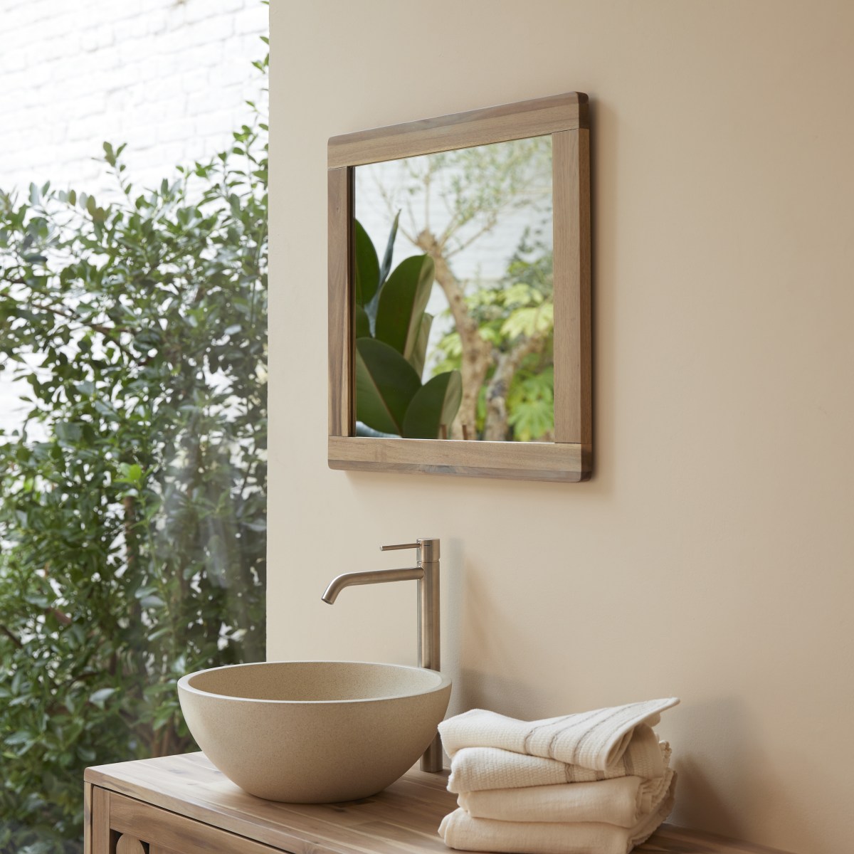 De Lila spiegel van massief FSC®-gecertificeerd acaciahout combineert natuurlijke charme met een strak design. Zijn lichte kleur en sobere lijnen passen bij elke stijl, of hij nu wordt gebruikt om een ruimte groter te laten lijken of boven een wastafel. Hij is gelakt voor een gemakkelijk onderhoud en past dankzij de elegantie van de Lila collectie echt overal in huis.