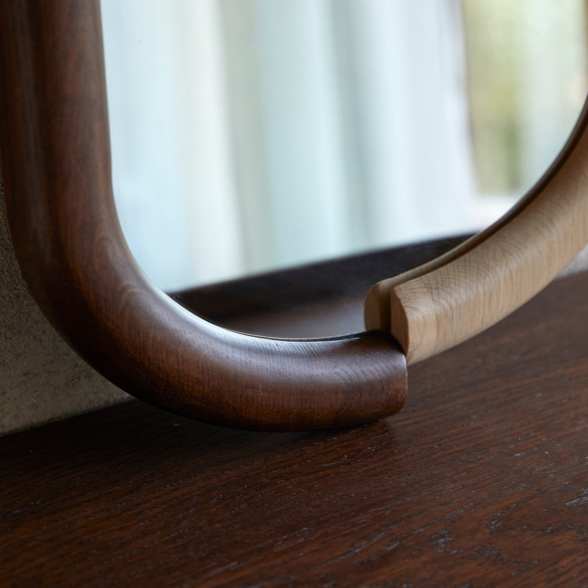 De Opéra spiegel, een topstuk uit de collectie van Charlotte Juillard voor Tikamoon en de Opéra National de Paris, is geïnspireerd op de bewegingen van dansers. Hij is gemaakt van Europees massief eikenhout, met een zorgvuldige montage en een geoliede afwerking die het hout mooi tot zijn recht laat komen. Met een gouden medaille op de achterkant past hij naadloos in elke ruimte. Een elegant en functioneel stuk met vloeiende lijnen die volledig in evenwicht zijn.