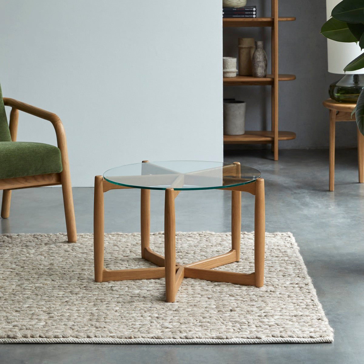 De Nori salontafel in massief eikenhout en glas combineert hedendaagse elegantie met een strak design. De geoliede afwerking beschermt het hout en garandeert duurzaamheid, terwijl het glazen blad de kamer visueel lichter maakt, ideaal voor kleine ruimtes.
