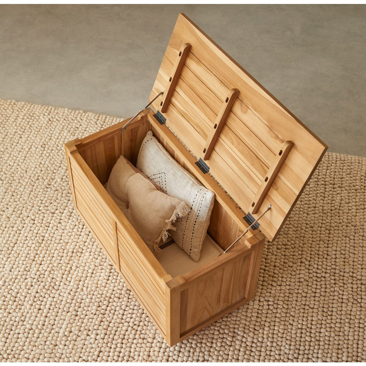 De Suzette massief teakhouten opbergkist combineert elegantie en functionaliteit met veel opbergruimte. Het trendy lattenontwerp benadrukt de natuurlijke blonde kleur van het FSC®-gecertificeerd hout.