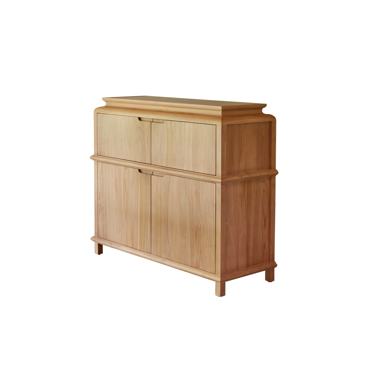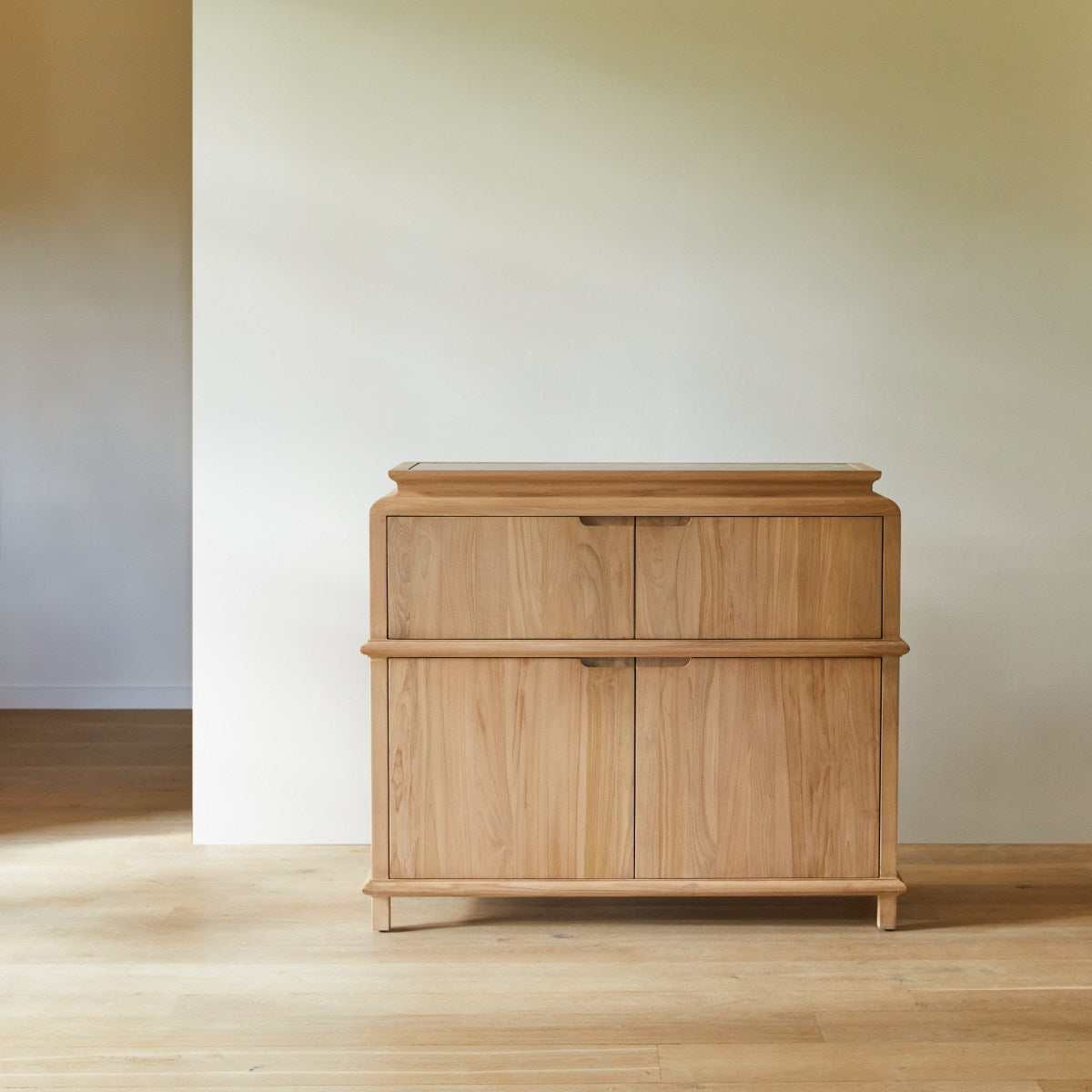 De Achille buffetkast van massief FSC®-gecertificeerd teakhout wordt gekenmerkt door een blad van lichtgrijze keramiek en een afwerkingsprofiel met 3 sierlijsten dat de gebruikte hoogwaardige technieken uit de meubelmakerij benadrukt.