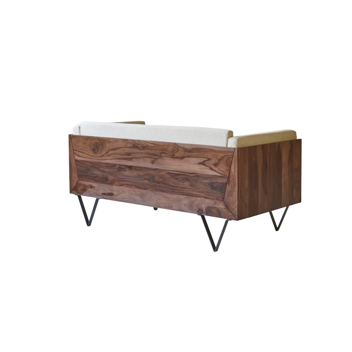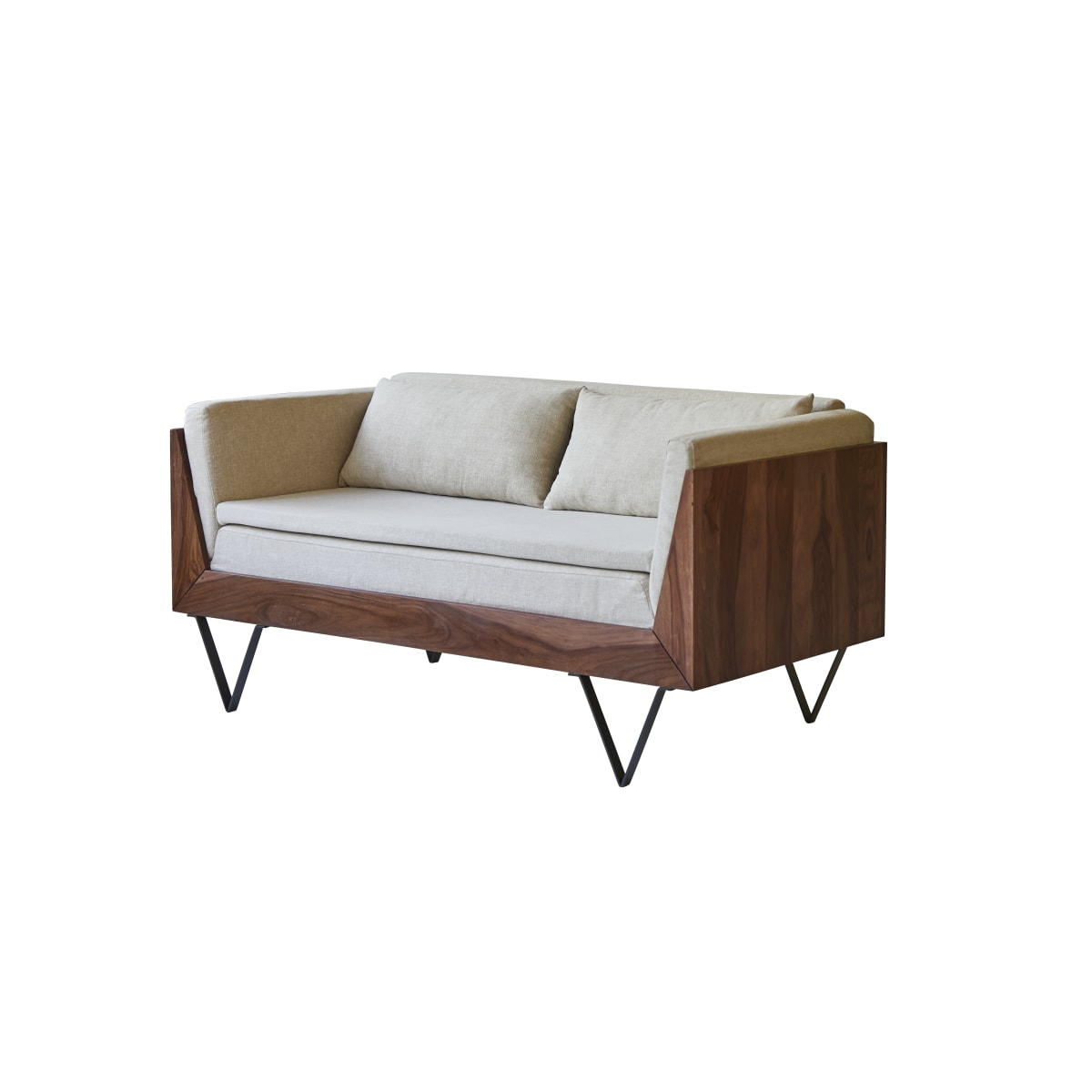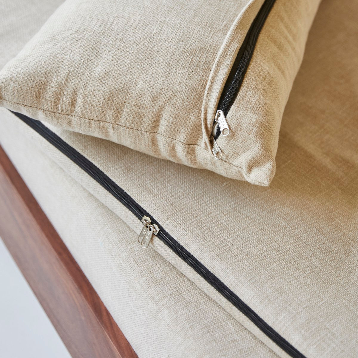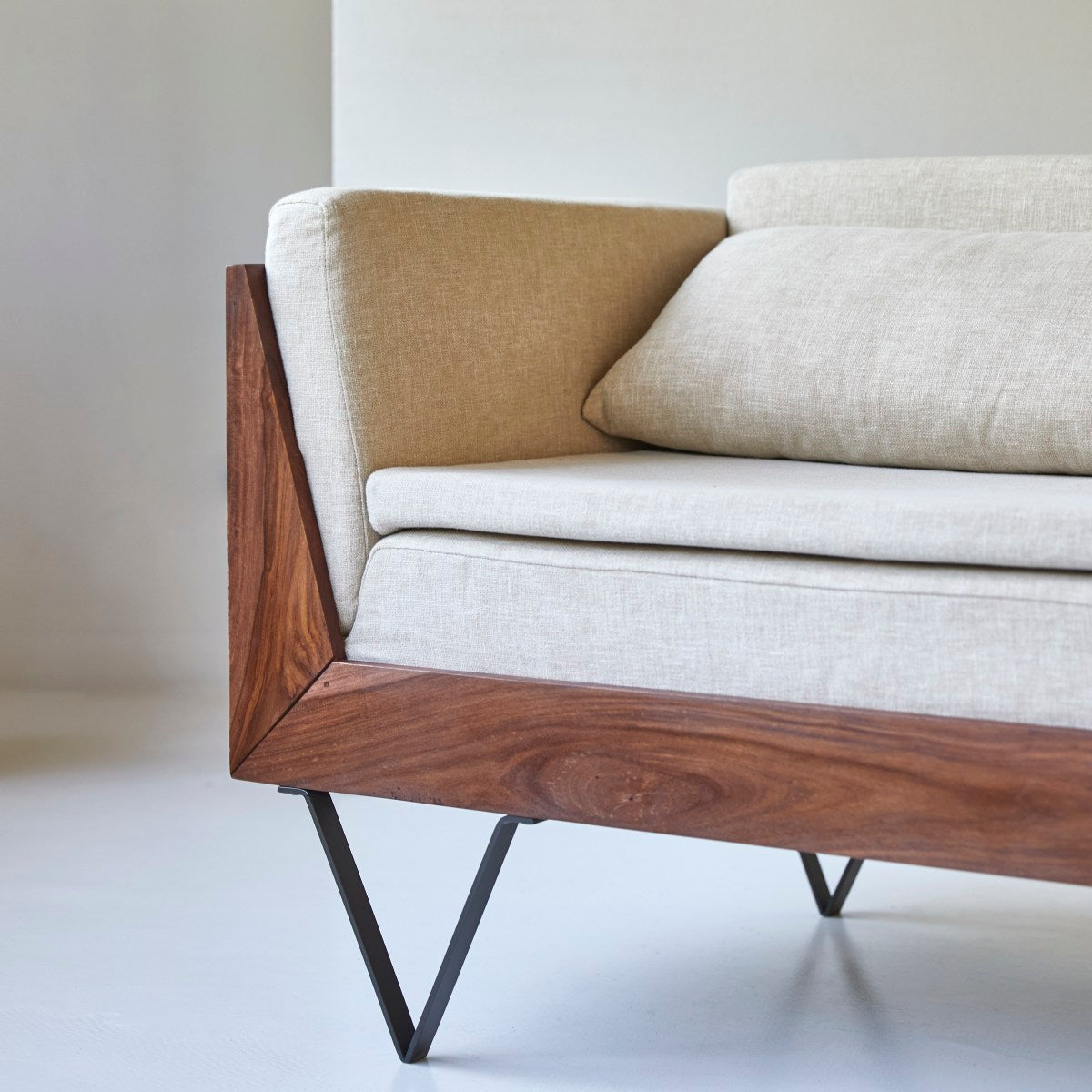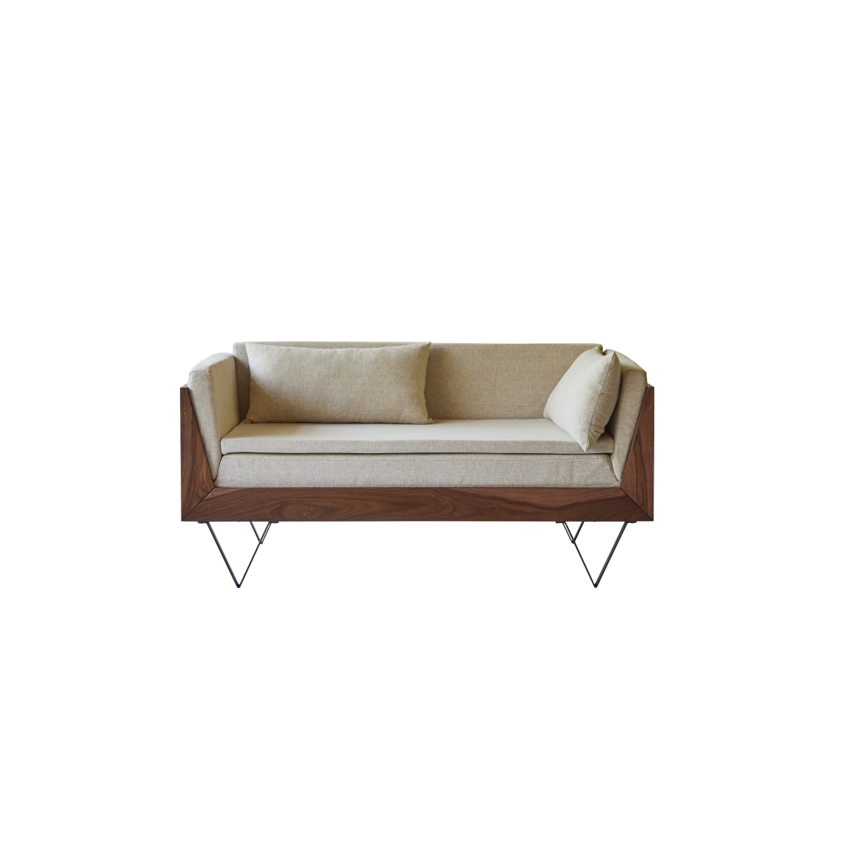 De Metric sofa in massief palissander en ecru stof is zeer aantrekkelijk door het mooie hout met kleurrijke tinten en zichtbare nerven... en door zijn elegante soberheid. Wij houden van de minimalistische lijnen, het strakke ontwerp dat wordt verzacht door de comfortabele stoffen zittingen en de originaliteit van de draadpoten die de grafische stijl accentueren. De bijzondere bank Metric geeft een moderne look aan een klassieke woonkamer of accentueert de moderne stijl van een interieur door de combinatie met een moderne salontafel zoals de Niels tafel in massief palissander.