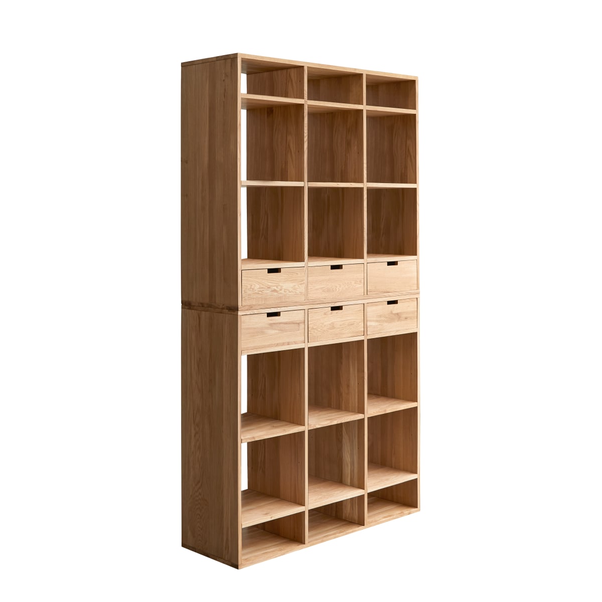 De hoge boekenkast Miho van massief eiken heeft veel opbergruimte en is ideaal voor het uitstallen van boeken en decoratieve voorwerpen. Het is een echt middelpunt van uw woonkamer en kan ook worden geplaatst in de slaapkamer van de ouders of de kinderen (om spelletjes en speelgoed opgeruimd te houden), in de werkkamer of in een ruime hal. Het slimme ontwerp kan ook worden gebruikt om een elegante scheiding te creëren tussen twee ruimtes in een kamer: de lades openen aan beide kanten van de boekenkast. Afhankelijk van de vereisten kunnen de twee modules boven elkaar of naast elkaar worden geplaatst om een verwijderbare scheidingswand te vormen of om bijvoorbeeld een kantoorgedeelte in de eetkamer te isoleren.