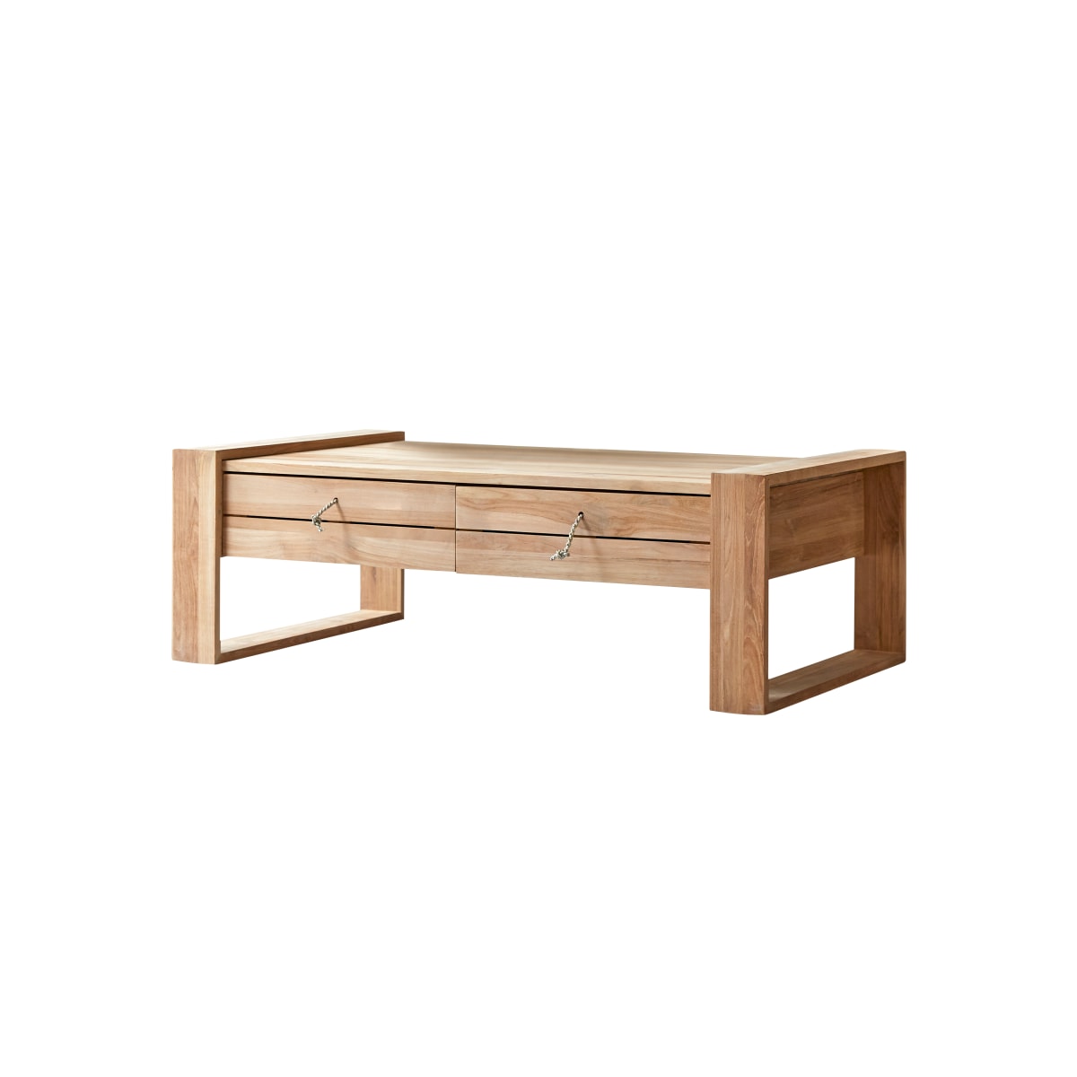 Mooie salontafel van massief teakhouten latten met FSC-certificaat®. Deze te demonteren salontafel met 4 laden zal perfect staan in uw woonkamer, voor een warme en gezellige sfeer. Een kwaliteitsmeubel, sober en design, met eenvoudige en elegante vormen. Dit meubel maakt deel uit van de Minimalys collectie : kwaliteit en stijl volgens Tikamoon!