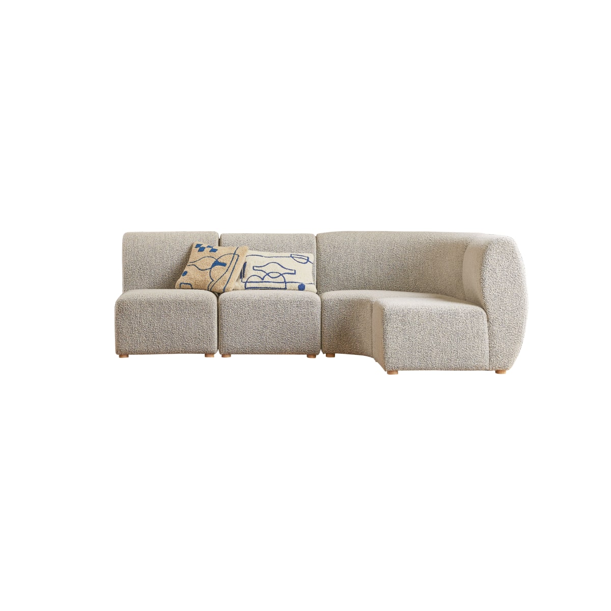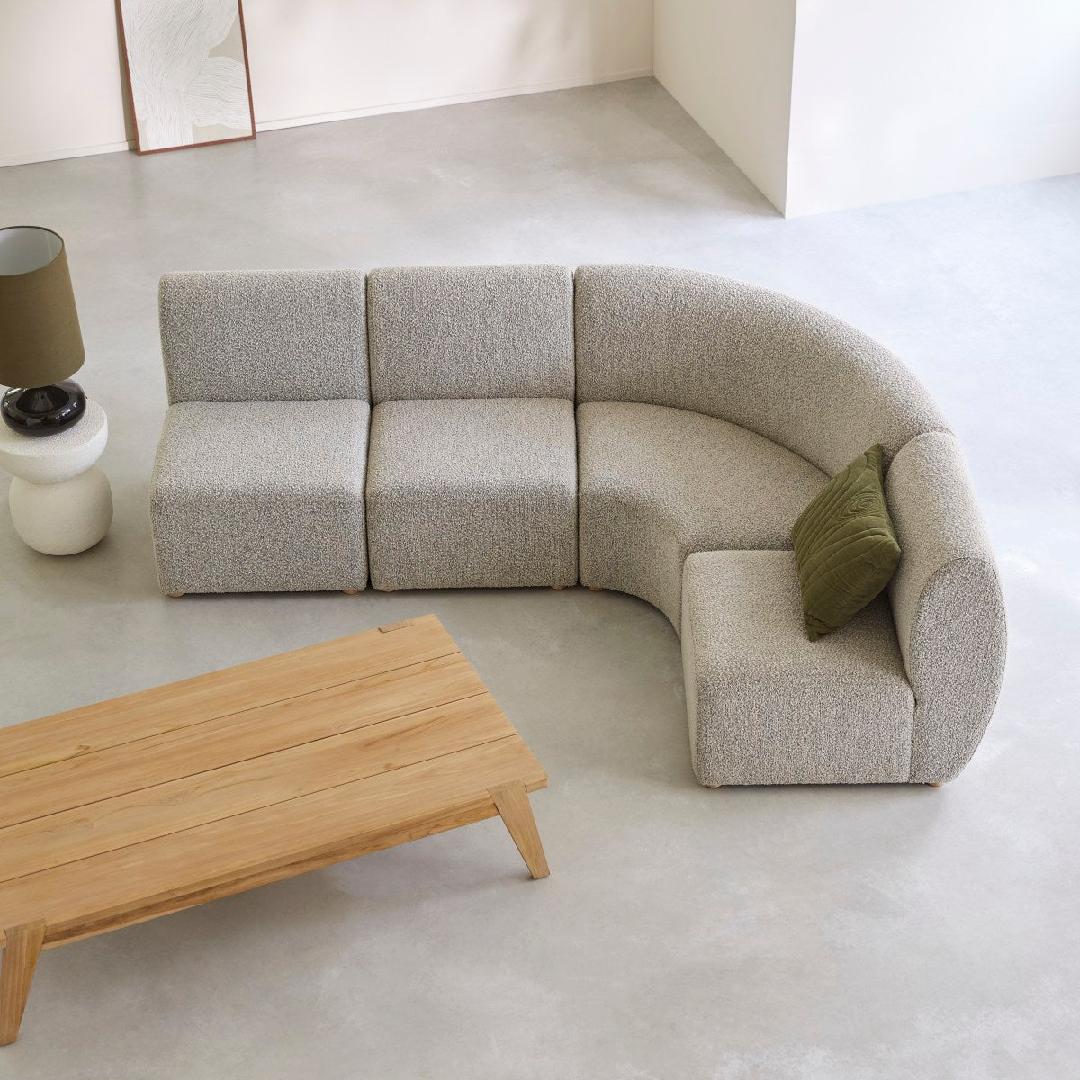 Maak kennis met modulaire hoekbank Swann van massief acacia en grijze stof. Hij bestaat uit 3 rechte modules en een hoekmodule die naar wens of behoefte kunnen worden gecombineerd of gescheiden.