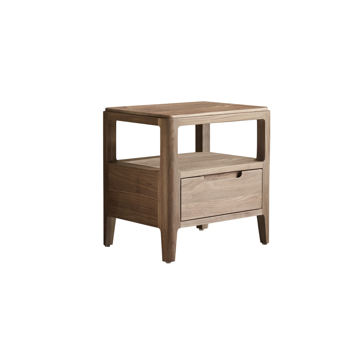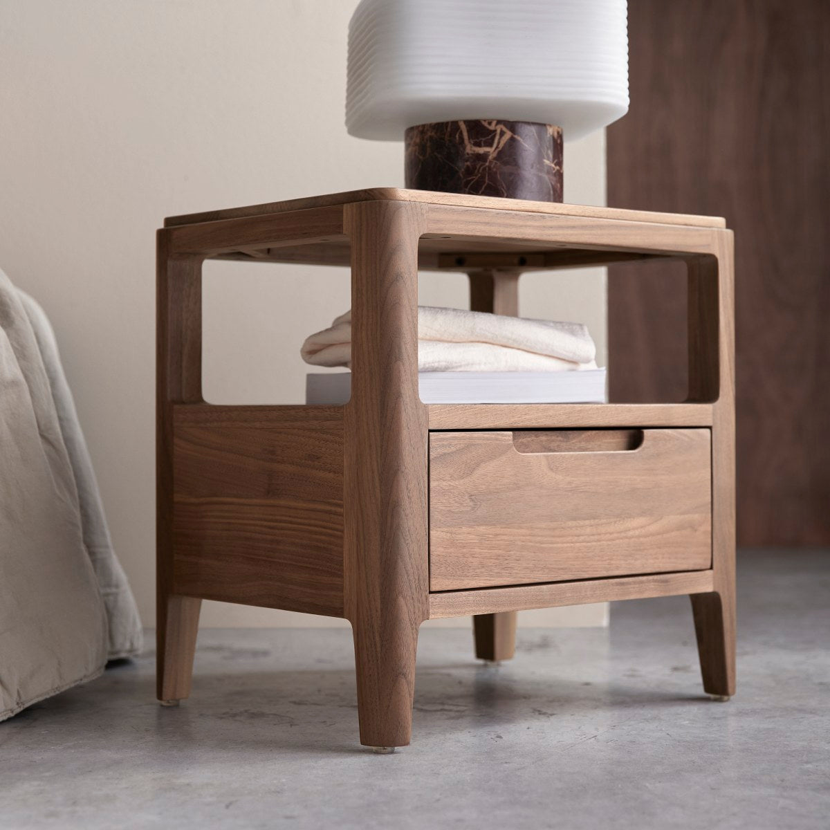 Het Arto nachtkastje met 1 lade van massief notenhout, gekozen door Tikamoon, combineert tijdloze elegantie met natuurlijke charme dankzij zijn kostbare houtsoort en geoliede afwerking.