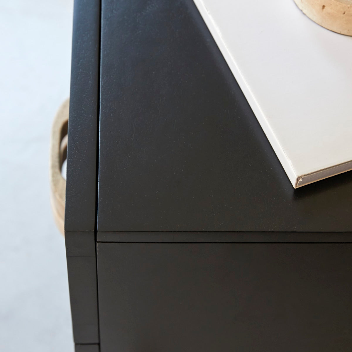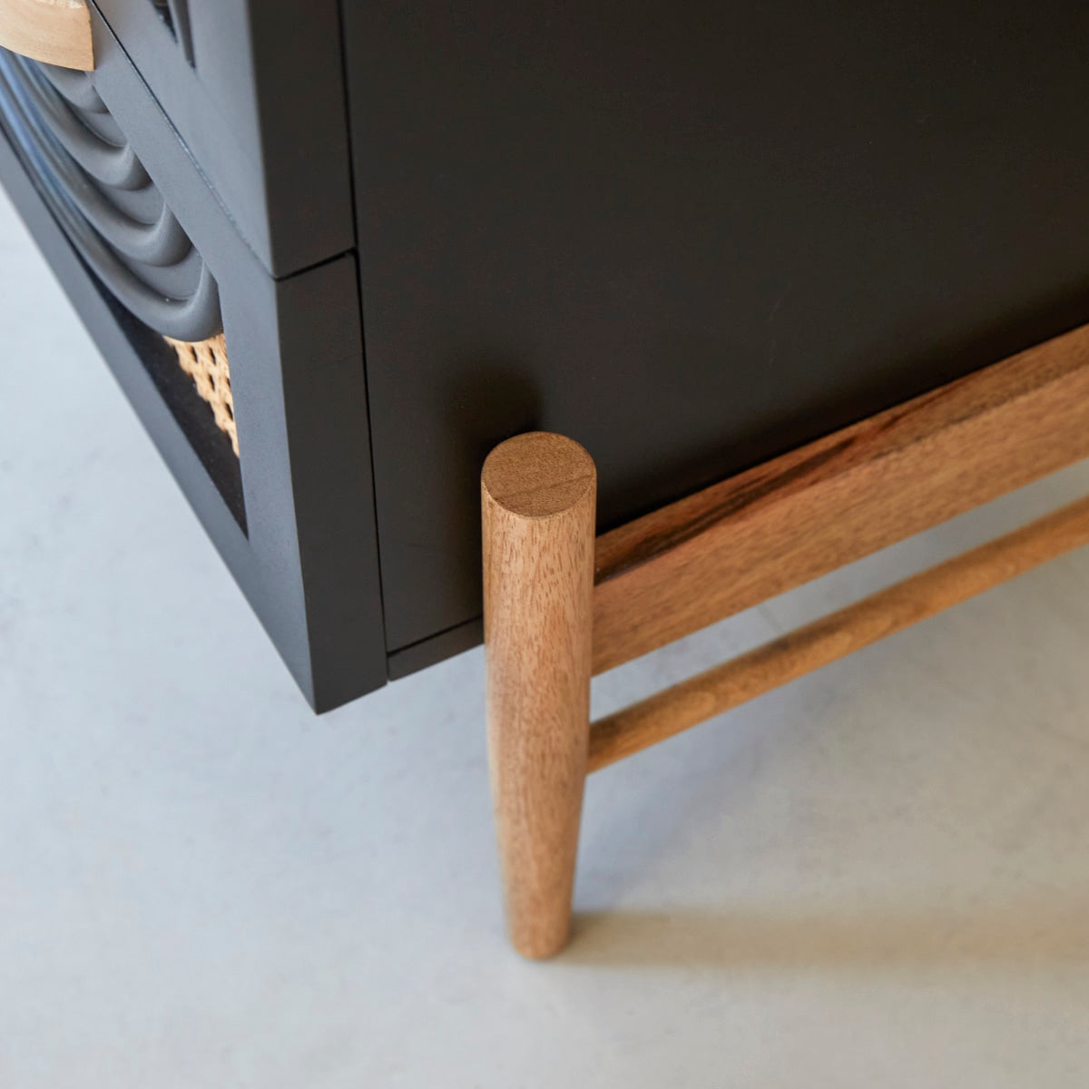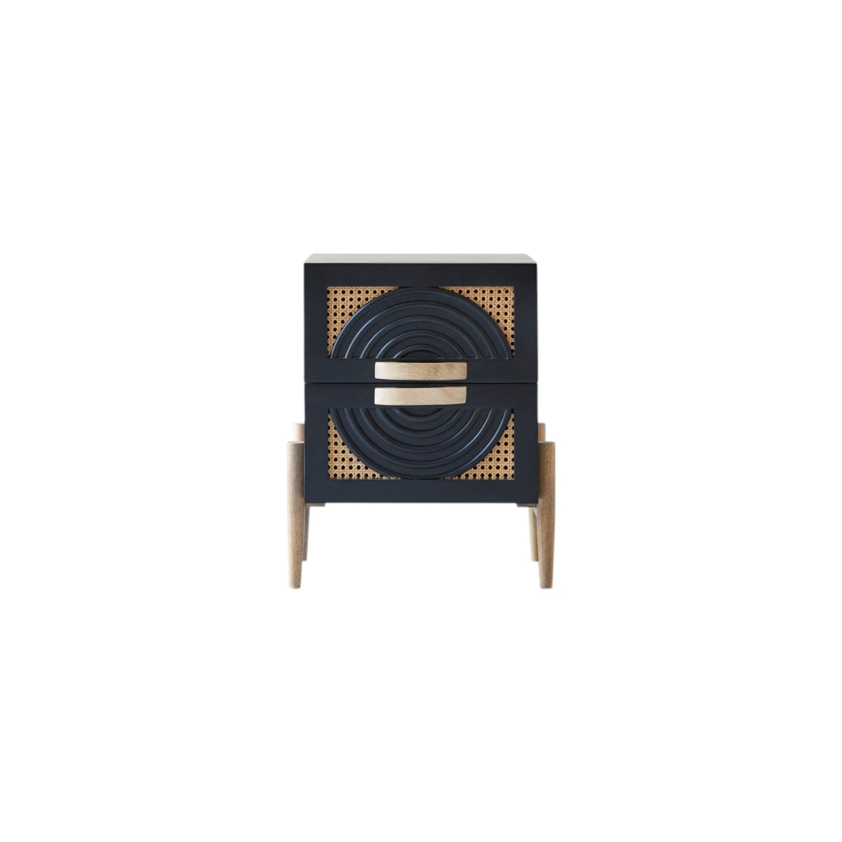 Het Sina nachtkastje van massief zwart mangohout en rotan is onweerstaanbaar met zijn moderne en neo-etnische elegantie. Met zijn twee lades en verrassende motief staat het prachtig in elke slaapkamer. Het is praktisch voor dagelijks gebruik, voorzien van een sluiting en wordt gemonteerd geleverd. Het is ideaal met rotan hoofdborden en kan ook worden gecombineerd met andere meubels uit de Sina of Neo-etnische serie voor een exotische uitstraling.