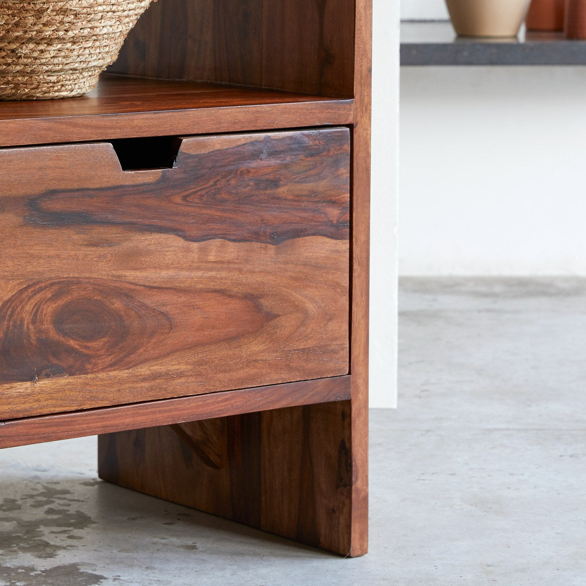 Het Kwarto opbergmeubel in massief palissander is tegelijk esthetisch en praktisch, met een grote lade en een brede nis.Dankzij zijn modulaire karakter volgt het perfect al uw behoeften: luiertafel, slaapkamermeubel of wastafelmeubel.Dit vochtbestendige meubel is de ideale aanvulling op de Kwarto collectie in palissander, eik of teak voor een warm interieur.